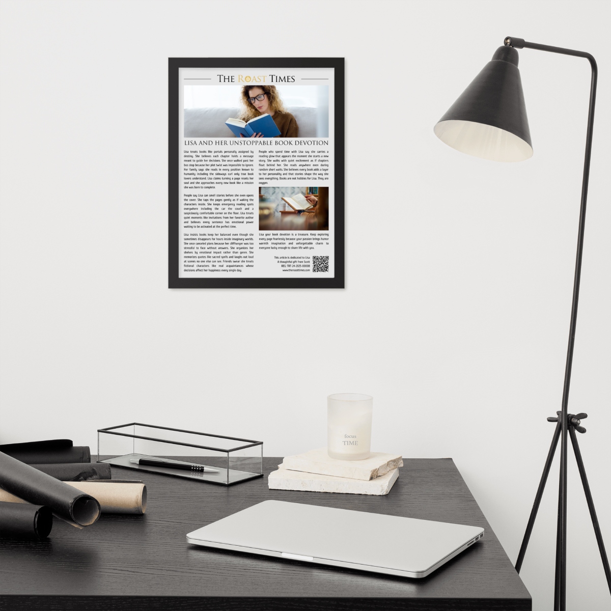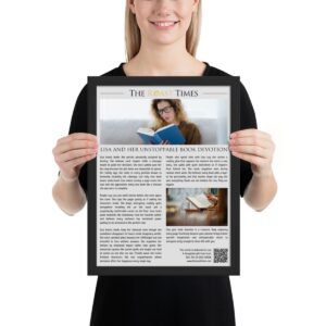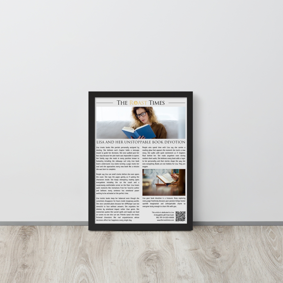 This framed editorial piece is the perfect gift for anyone who treats books as essential companions rather than objects. Written in the signature The Roast Times style, it highlights the humor personality and emotional depth that define true book lovers. Each article is printed and framed with careful detail, and it includes a QR code placed at the bottom of the framed piece. That same footer features a subtle mention of the person giving the gift, allowing the buyer to become part of the emotional meaning behind the tribute.