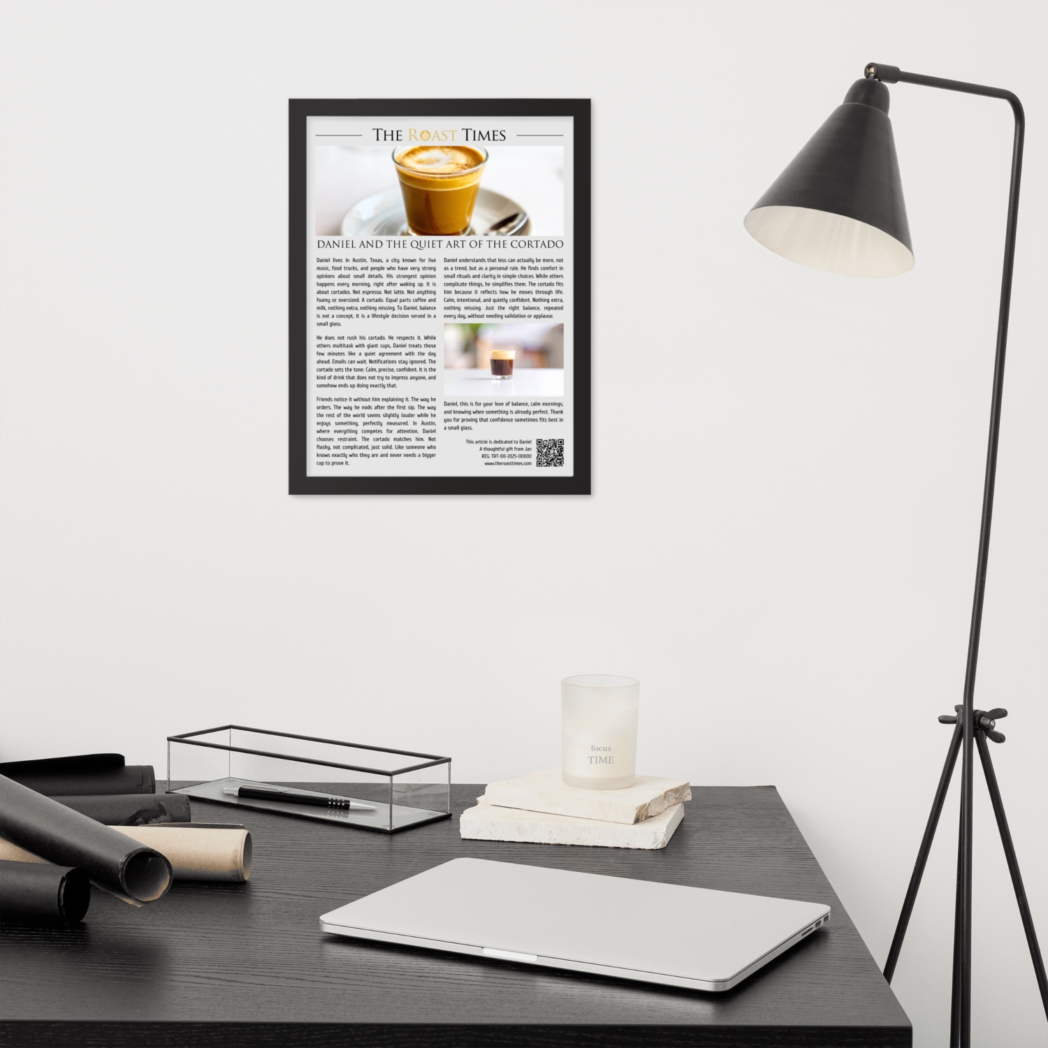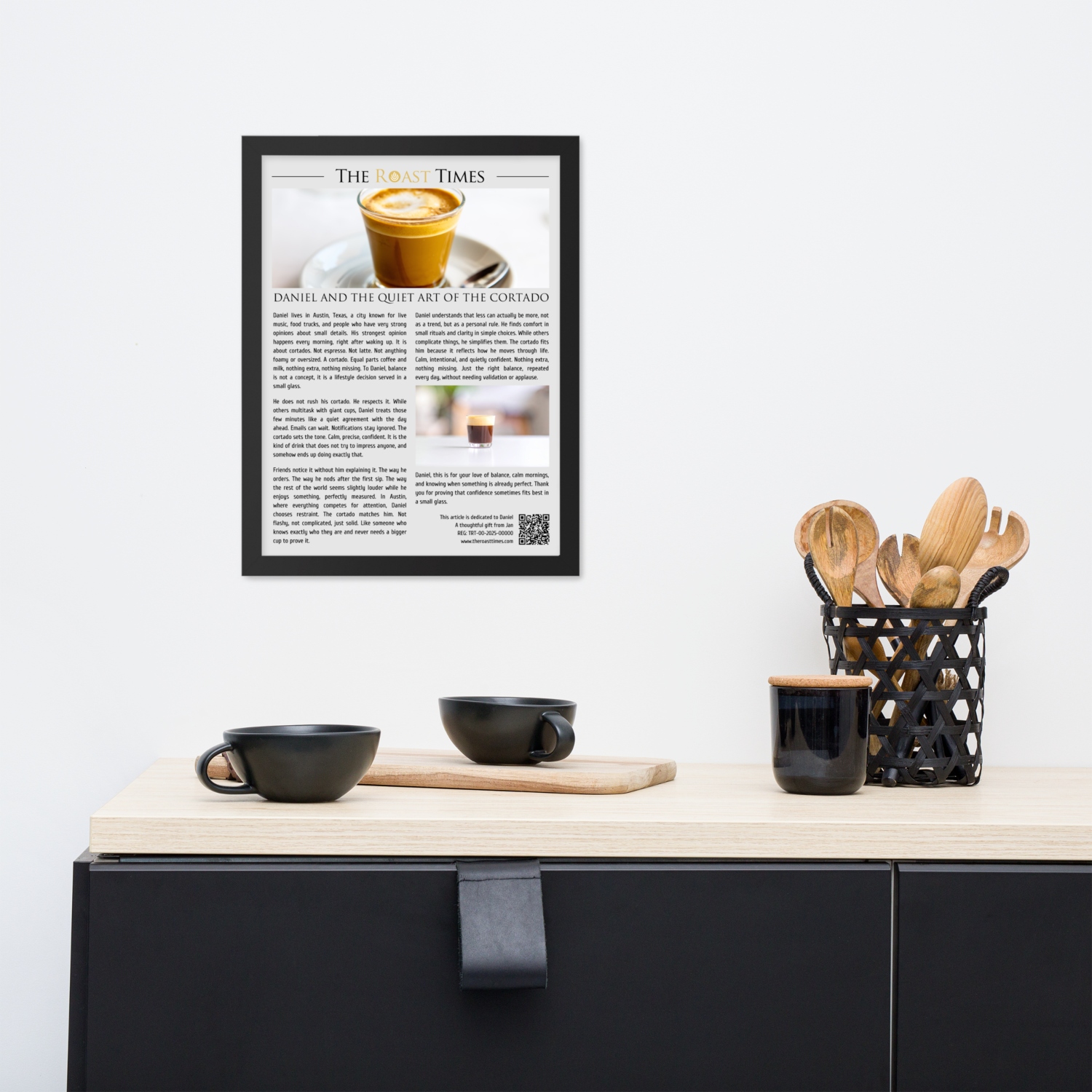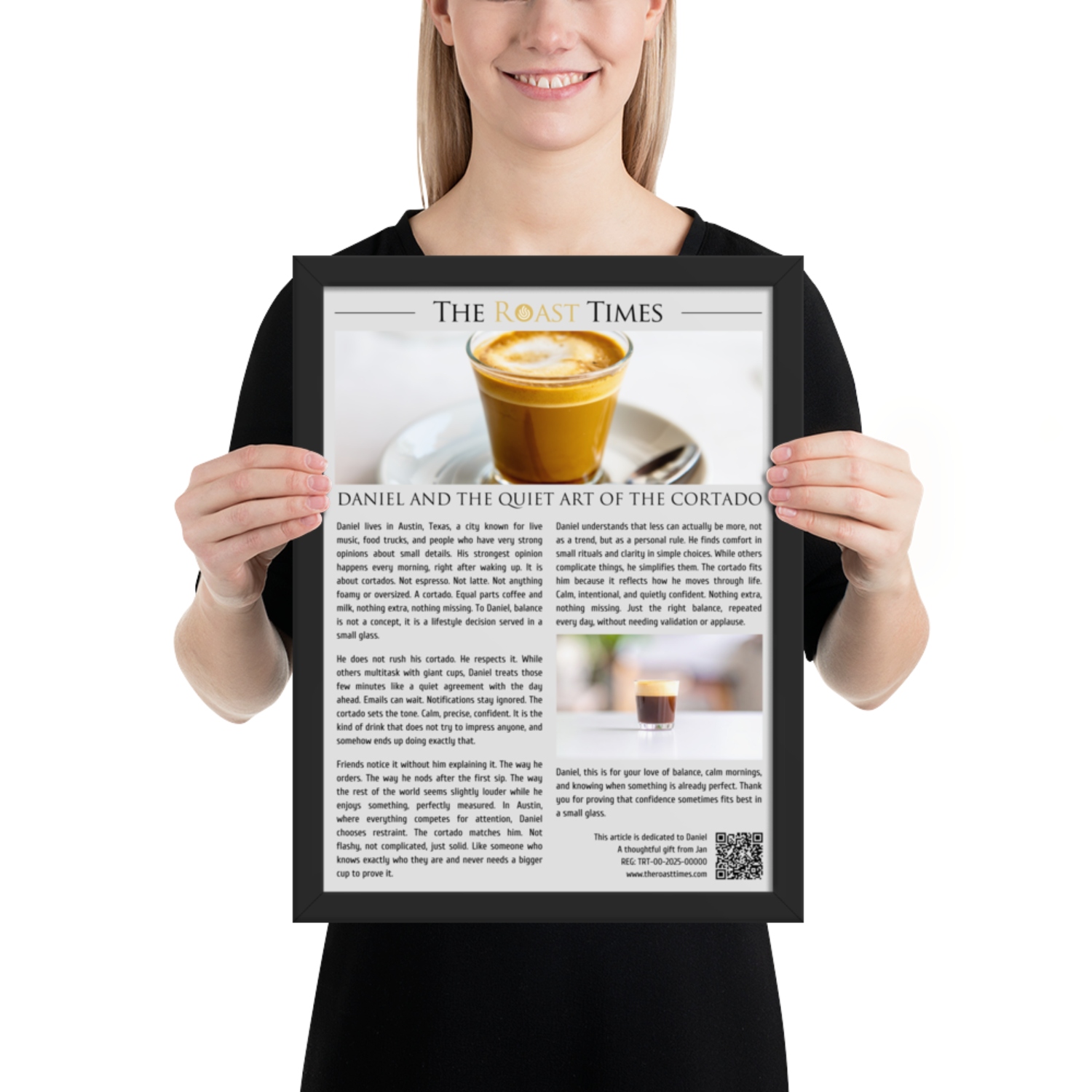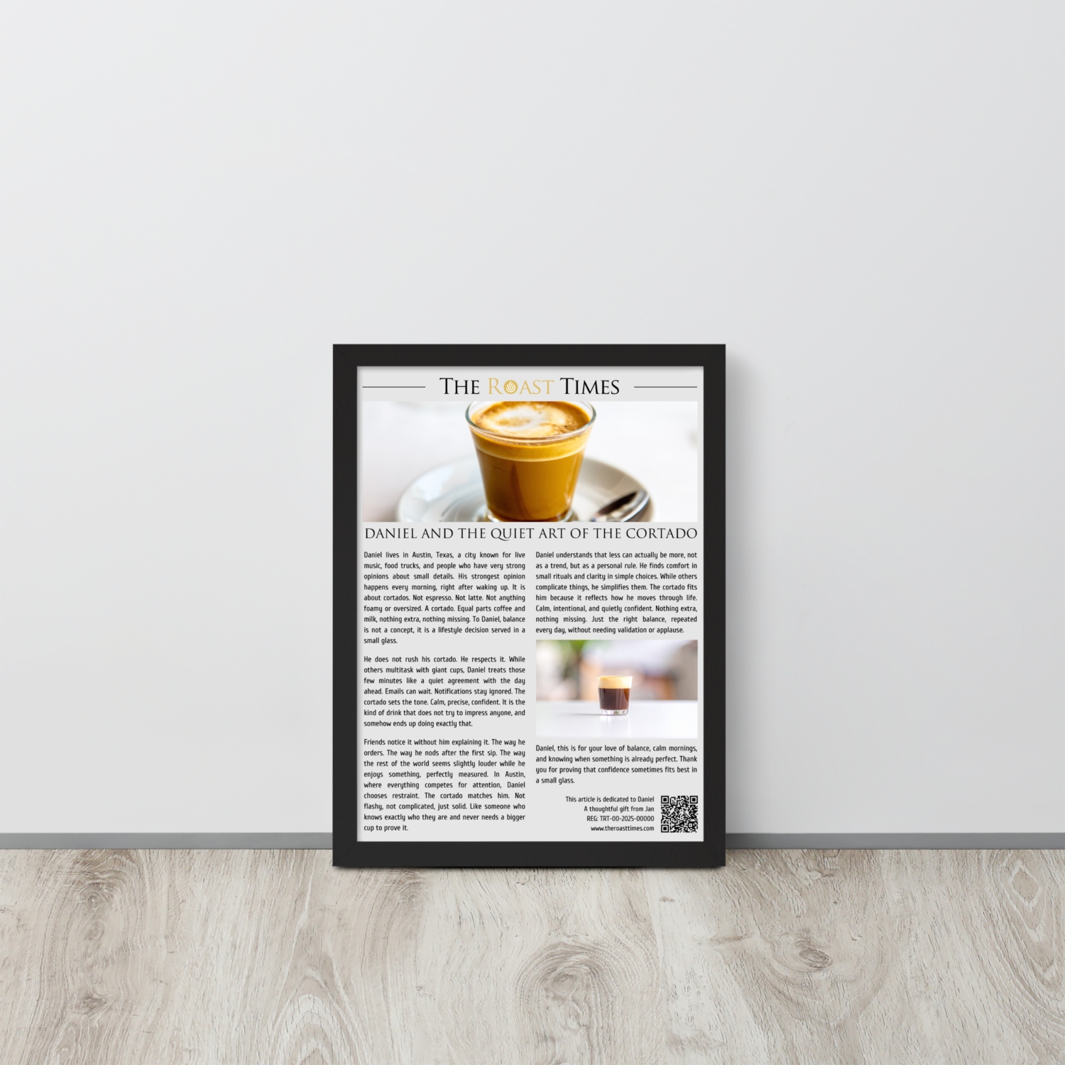 Each piece includes a professionally printed frame with a unique QR code at the bottom. By scanning it, the protagonist accesses a digital certificate that validates the authenticity of the article, confirms its unique serial number, and officially honors their cortado obsession. The certificate lives online as a permanent recognition.