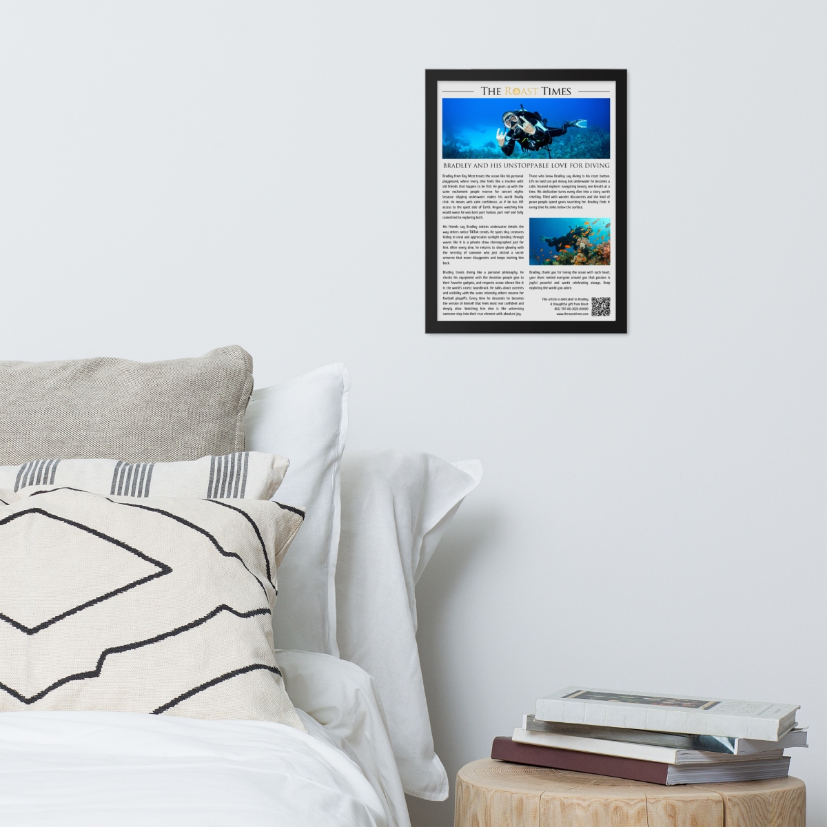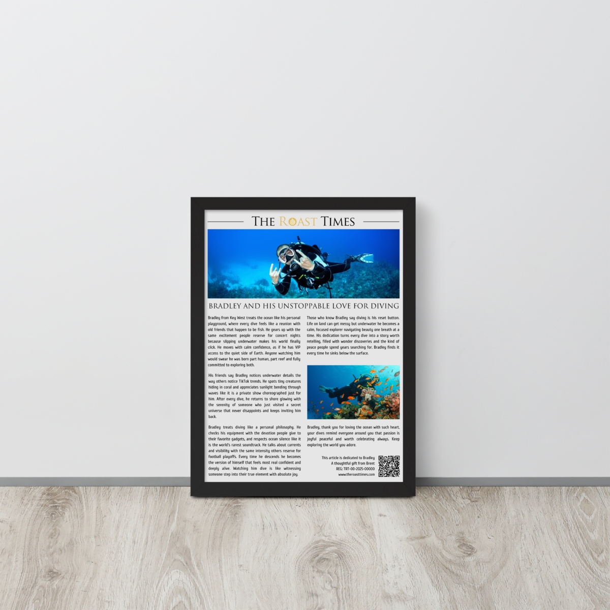 The framed article also includes a mention of the buyer printed subtly at the bottom as a symbolic thank you for choosing such a meaningful gift. Each order is co-created because you get to review and approve the draft before production begins, ensuring the final piece perfectly reflects the diver’s personality and passion for the ocean.