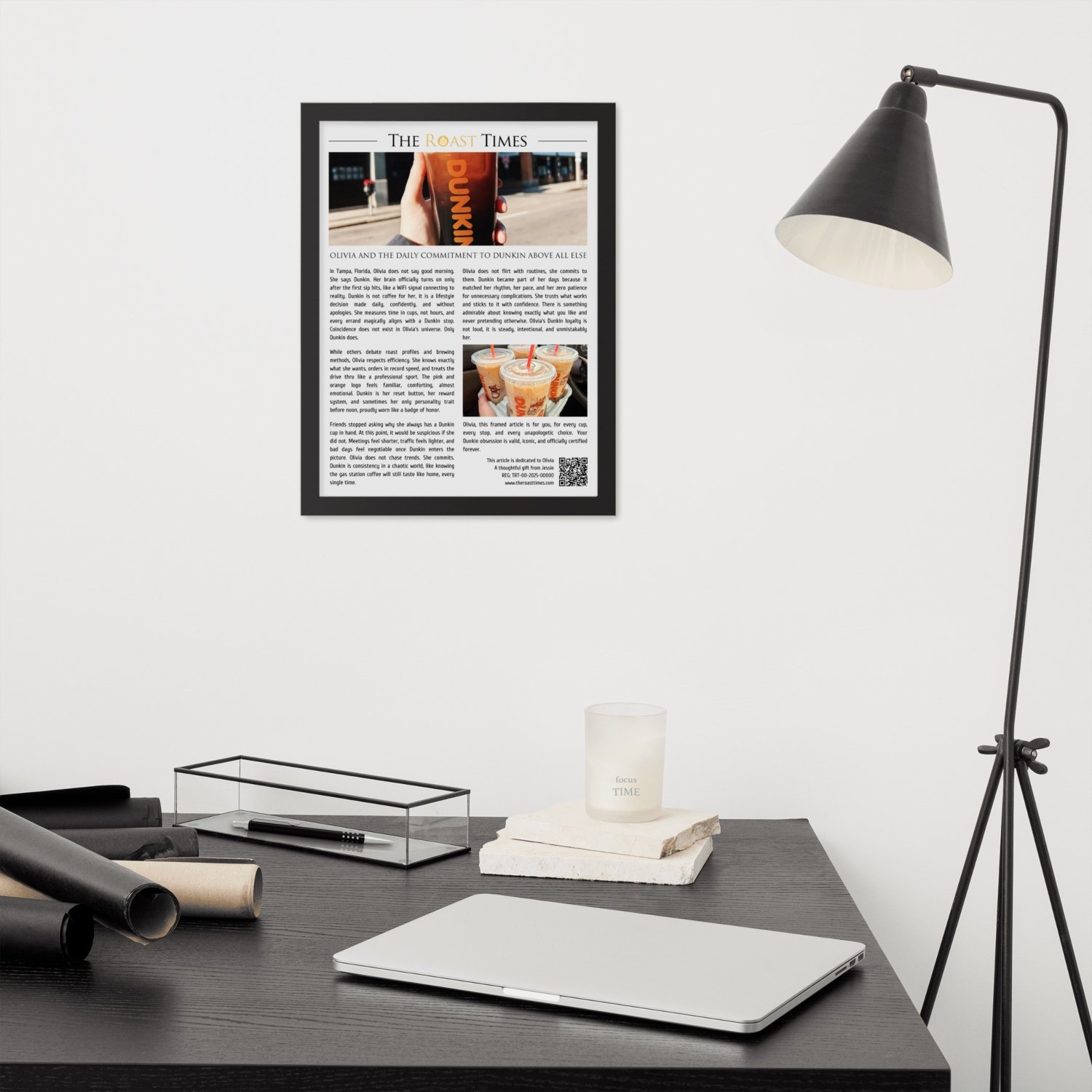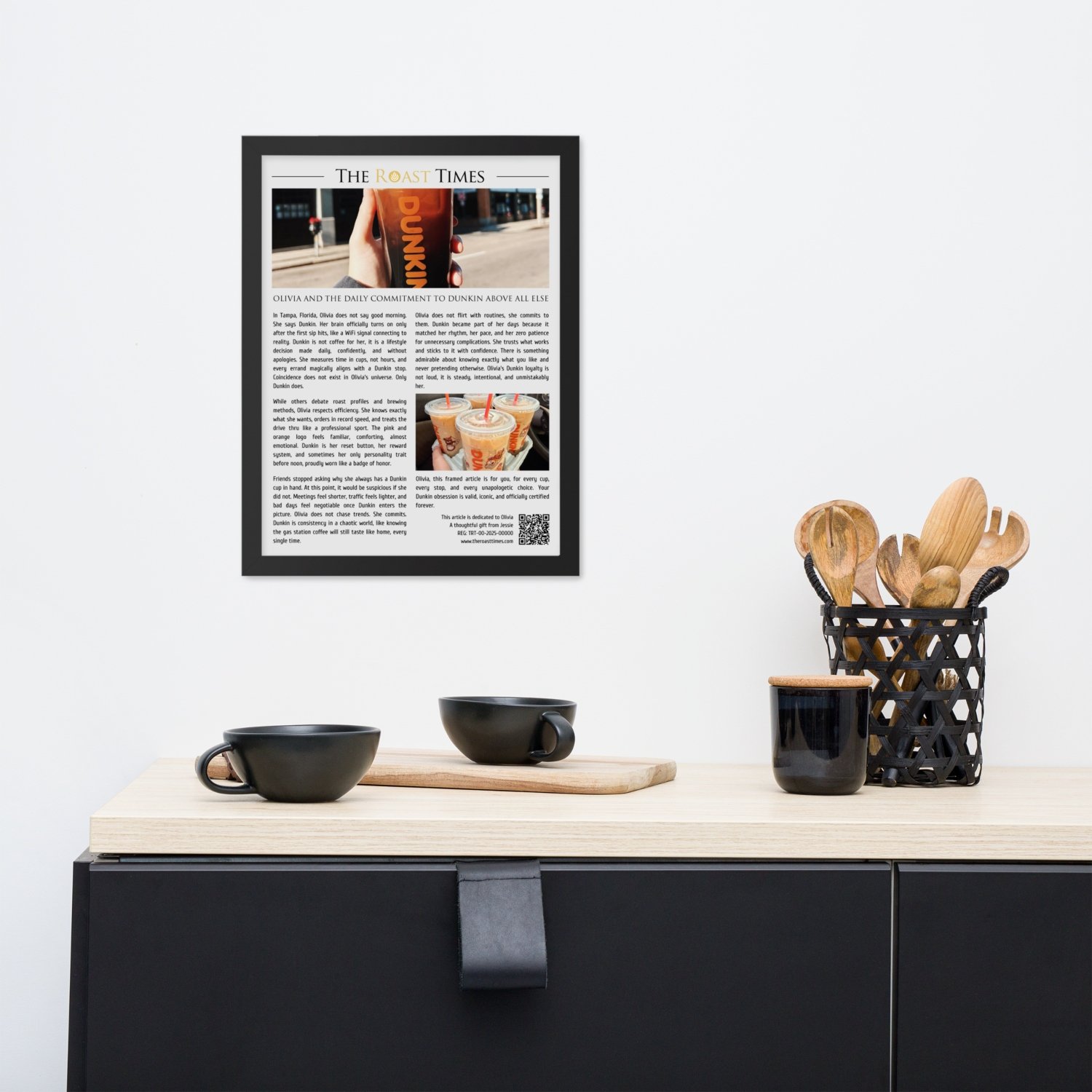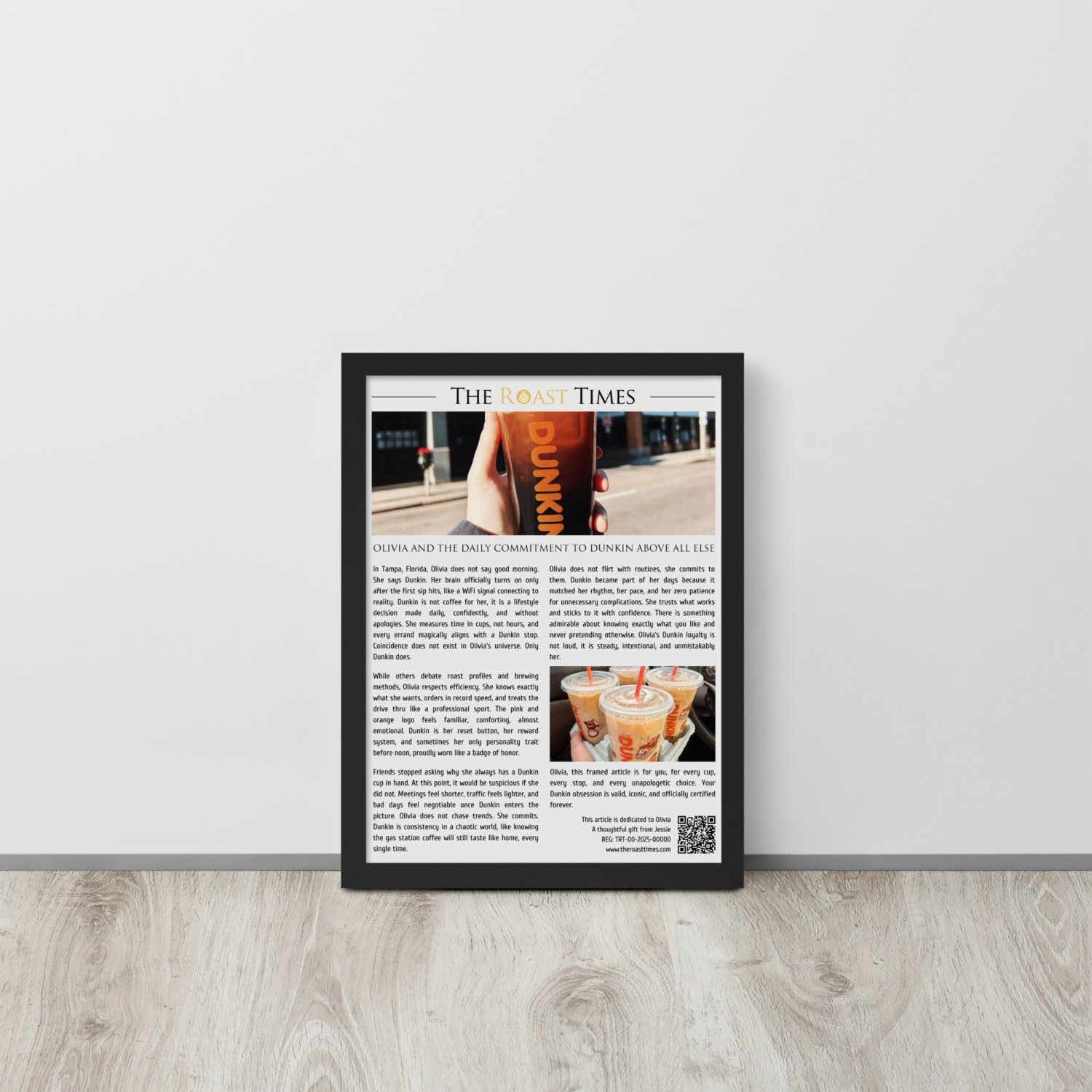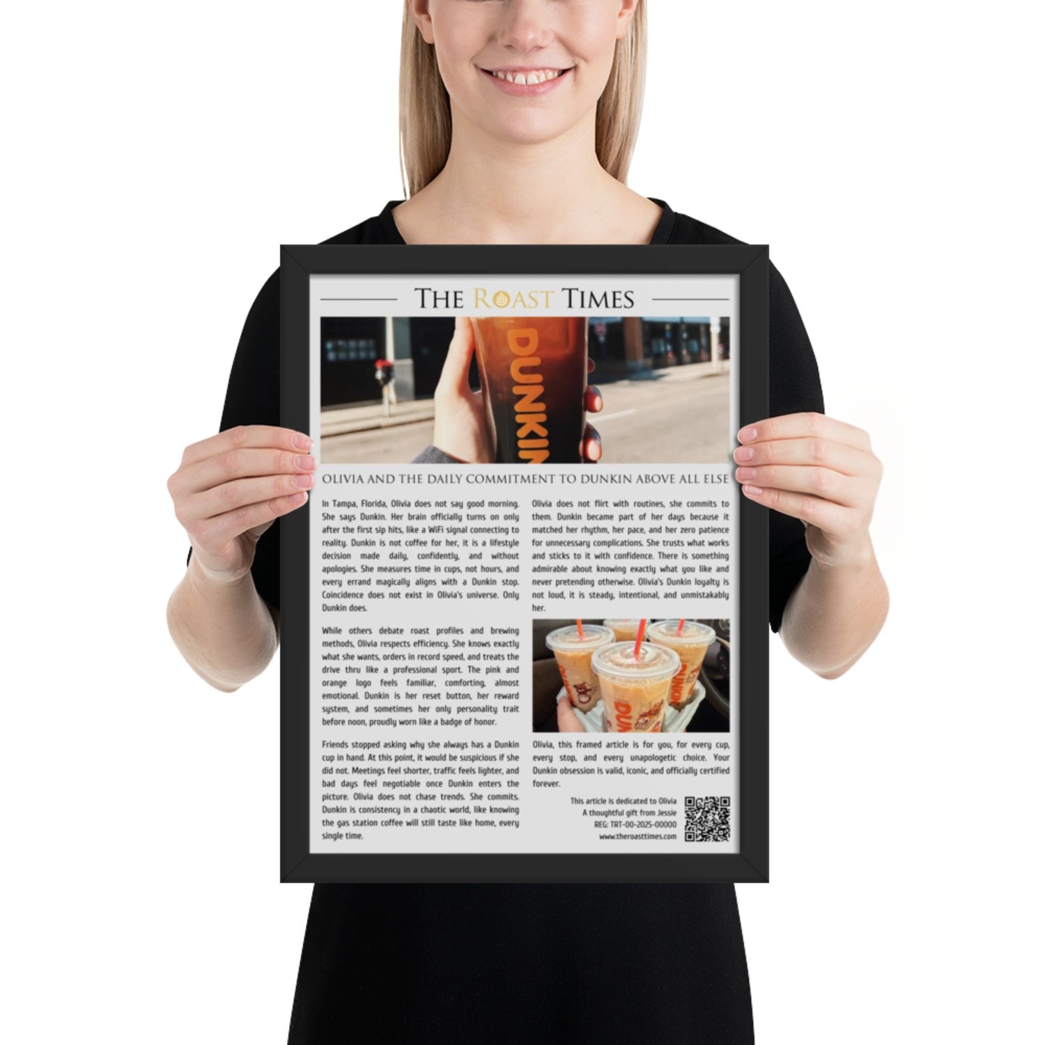 Olivia, this framed article is for you, for every cup, every stop, and every unapologetic choice. Your Dunkin obsession is valid, iconic, and officially certified forever.