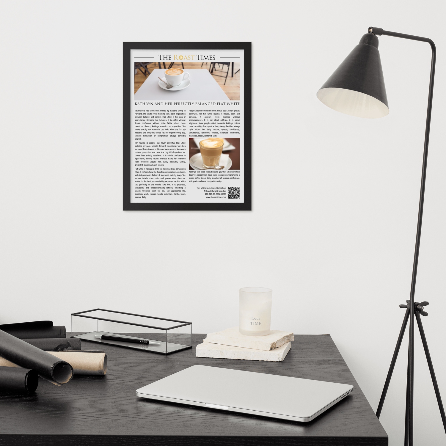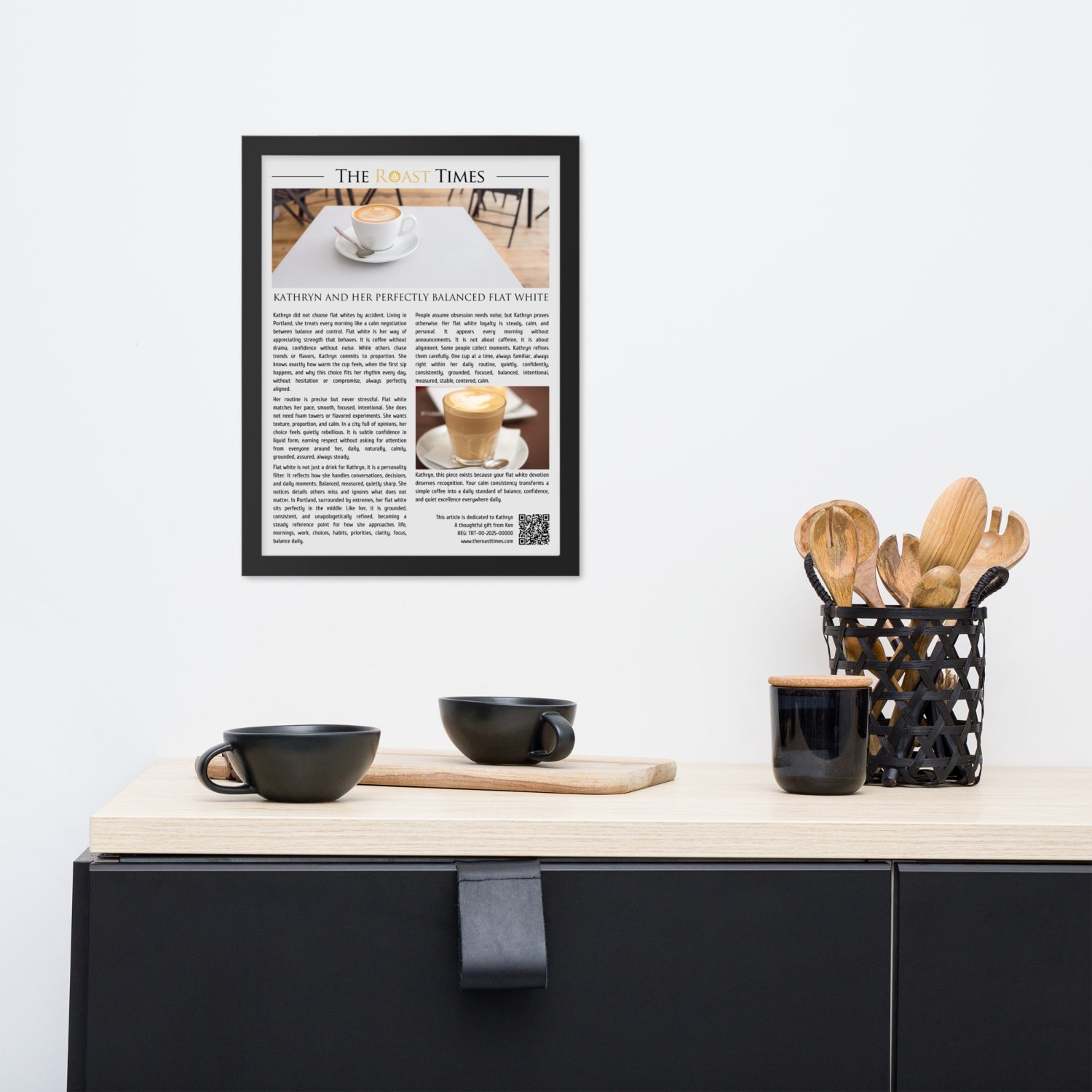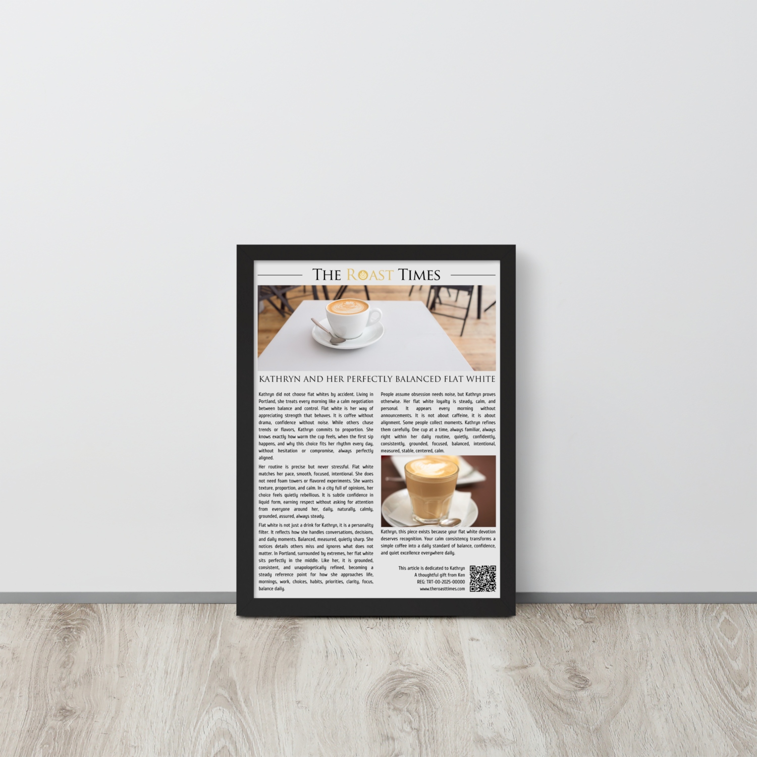 Each framed piece includes a printed QR code at the bottom of the article. When scanned, it gives access to a digital certificate that validates the artwork as original, confirms its unique serial number, and honors the protagonist as an official flat white lover. The certificate is part of the experience, not an add-on.