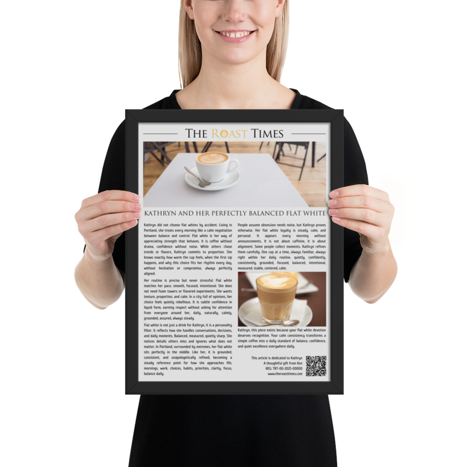 Kathryn, this piece exists because your flat white devotion deserves recognition. Your calm consistency transforms a simple coffee into a daily standard of balance, confidence, and quiet excellence everywhere daily.