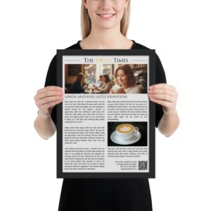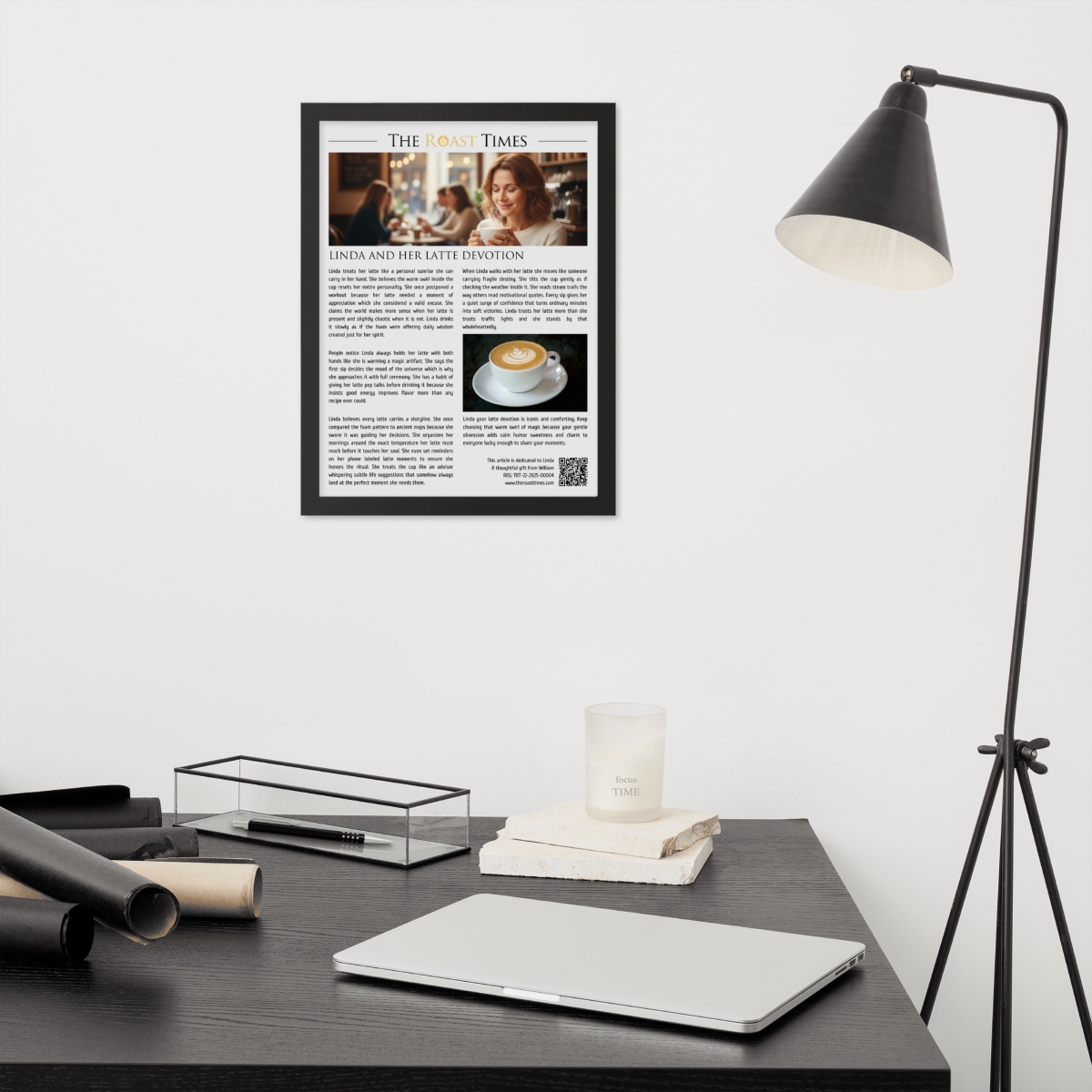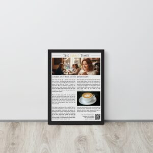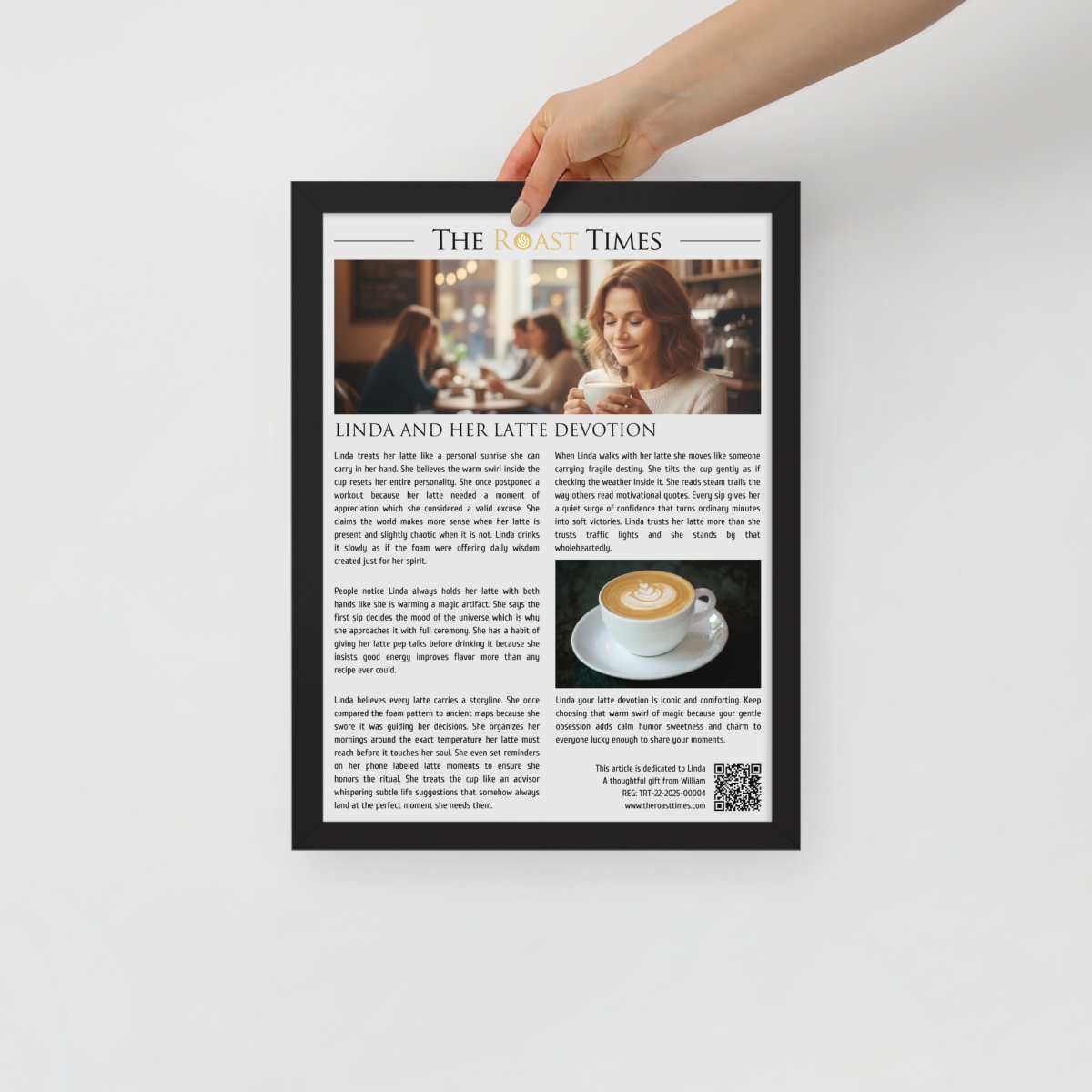 This framed editorial piece is the perfect gift for anyone who treats a latte as a daily ritual of warmth and clarity. Written in the signature The Roast Times style, it highlights the humor, personality and gentle devotion that define true latte lovers. Each article is printed and framed with careful detail, and it includes a QR code placed at the bottom of the framed piece. That same footer features a subtle mention of the person giving the gift, allowing the buyer to become part of the emotional meaning behind the article.