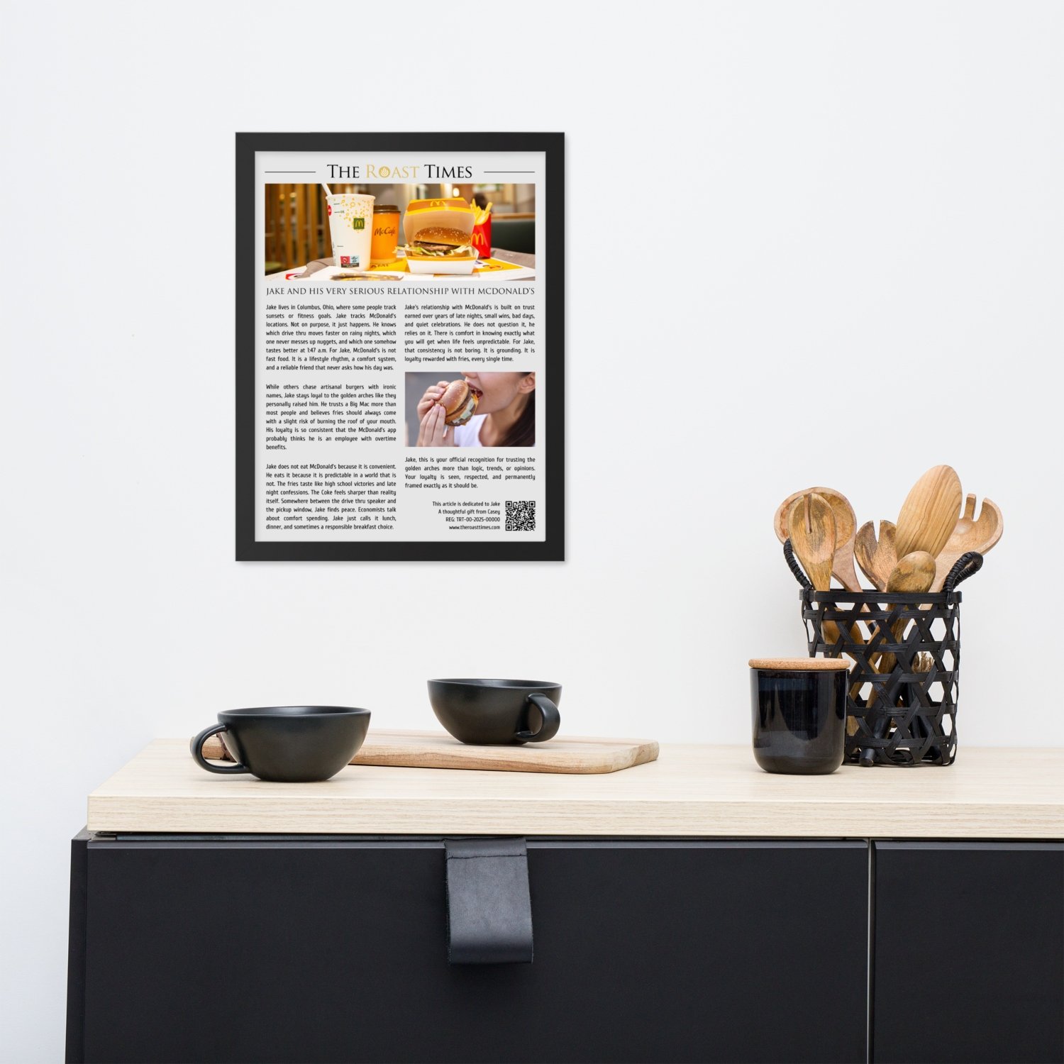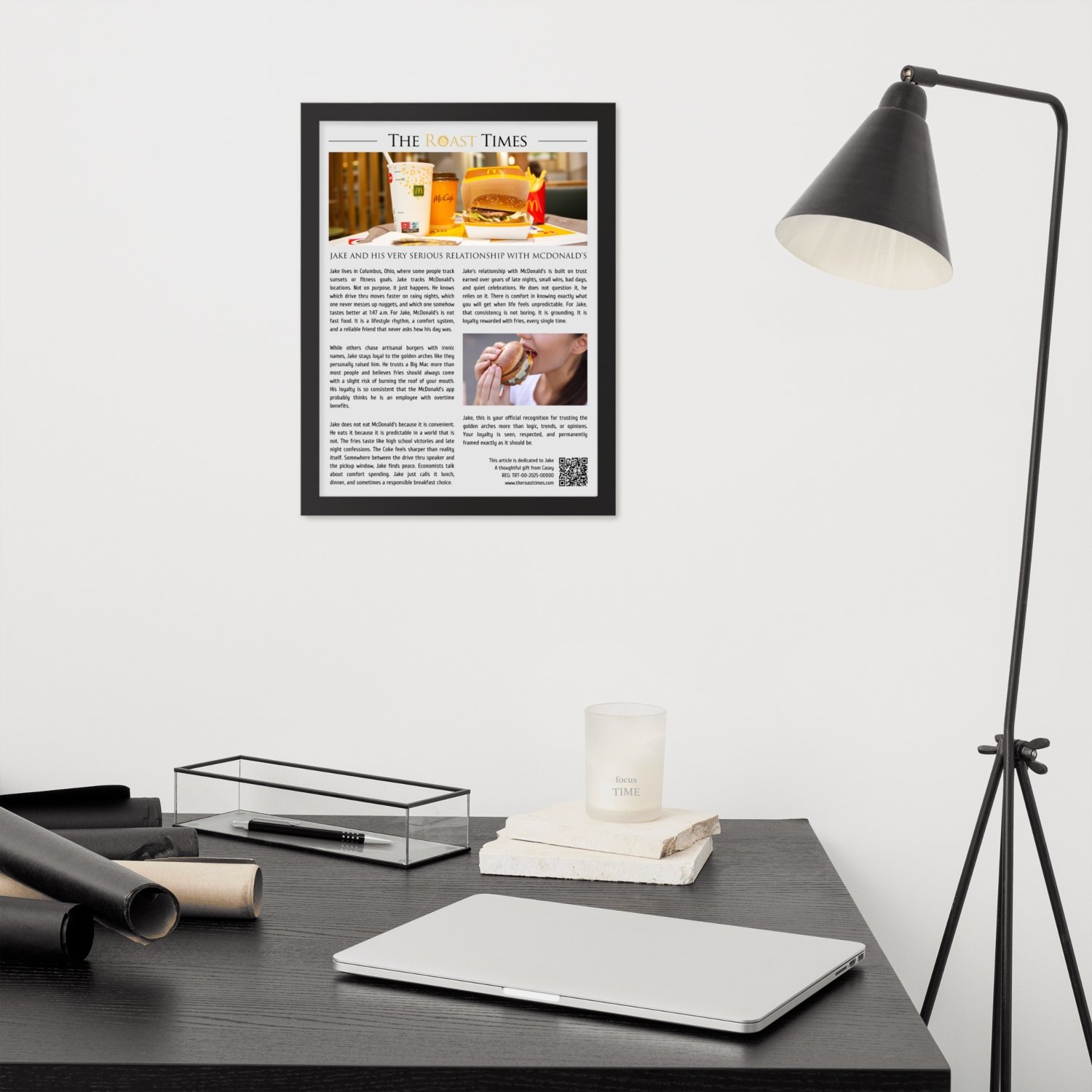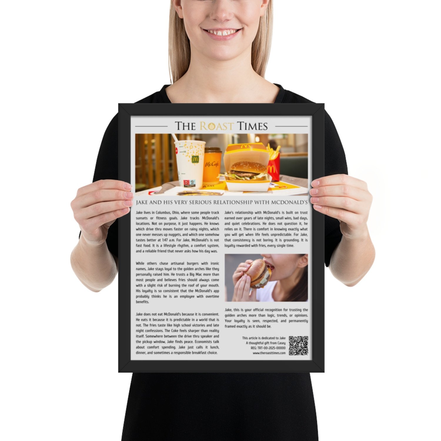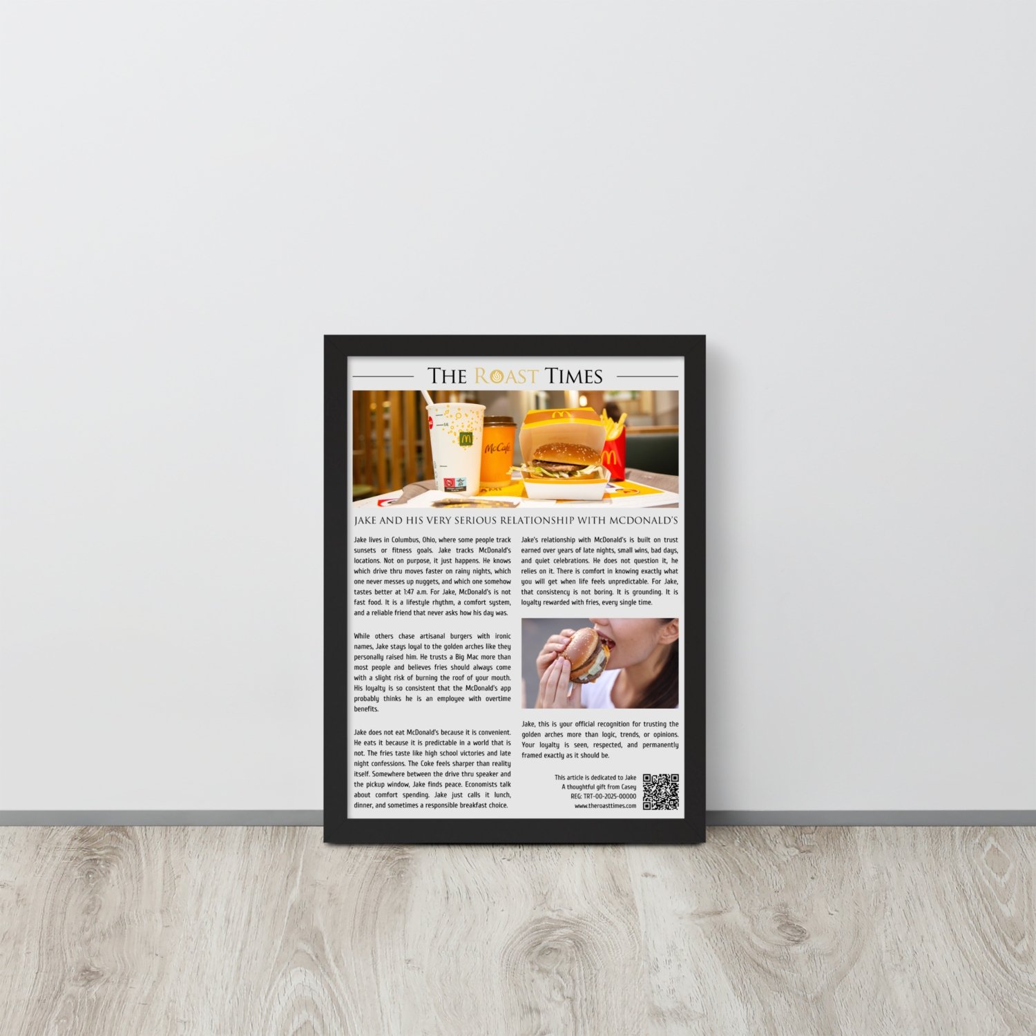 This framed article celebrates the kind of McDonald’s obsession that goes far beyond convenience. It honors loyalty, routine, and the comfort that only familiar fries and a perfect Coke can deliver. Designed as a premium gift, each piece features a printed QR code that links to a digital certificate validating authenticity and its unique serial number.