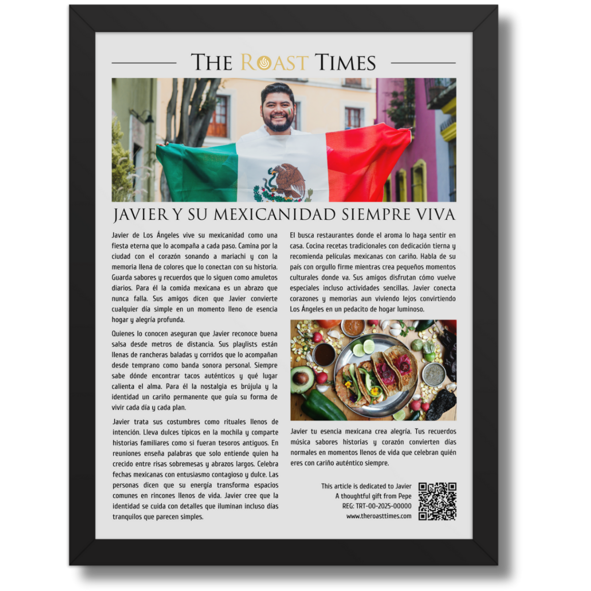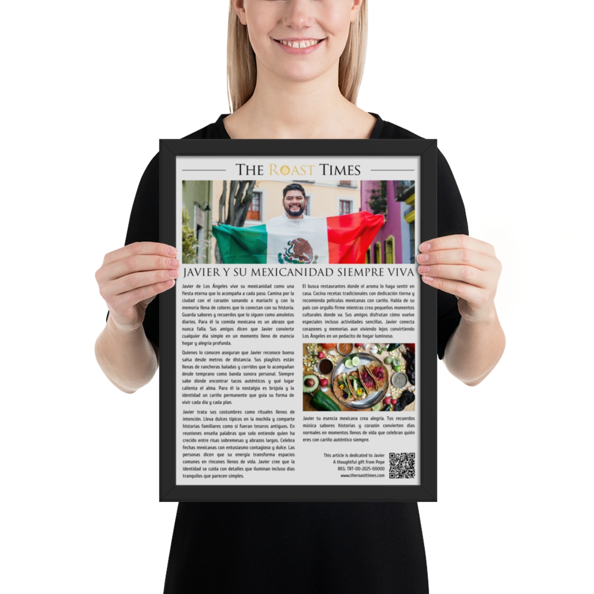 This framed editorial piece celebrates the person who lives their Mexican identity with pride music flavor and heart. Written in the signature The Roast Times style it highlights the joy nostalgia and unique personality traits that make their cultural essence unforgettable. Whether their obsession is food music traditions or memories this tribute brings their spirit to life with humor warmth and authenticity. Each framed article includes a QR code printed at the bottom along with a subtle mention of the gift giver so the buyer becomes part of the emotional meaning behind the tribute.