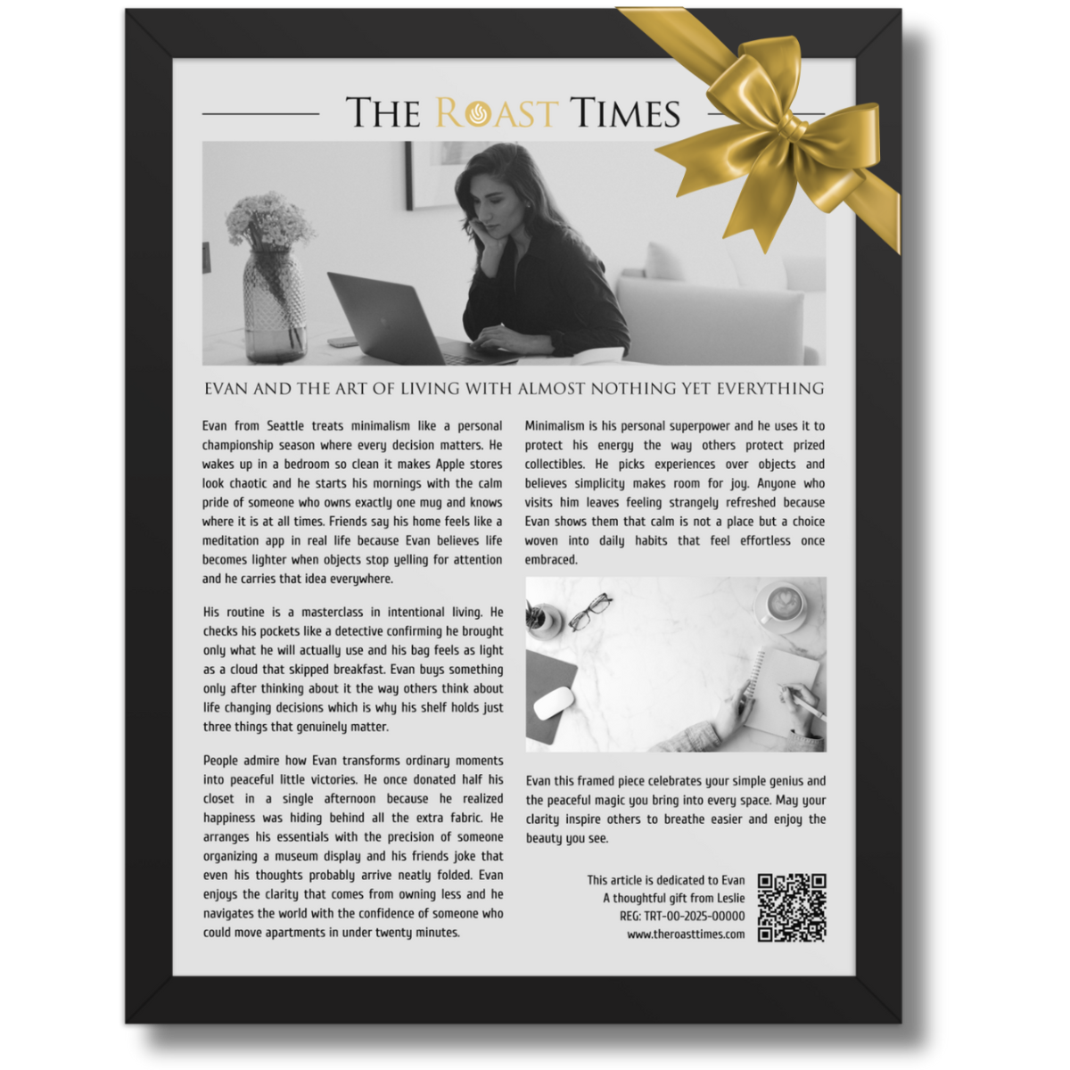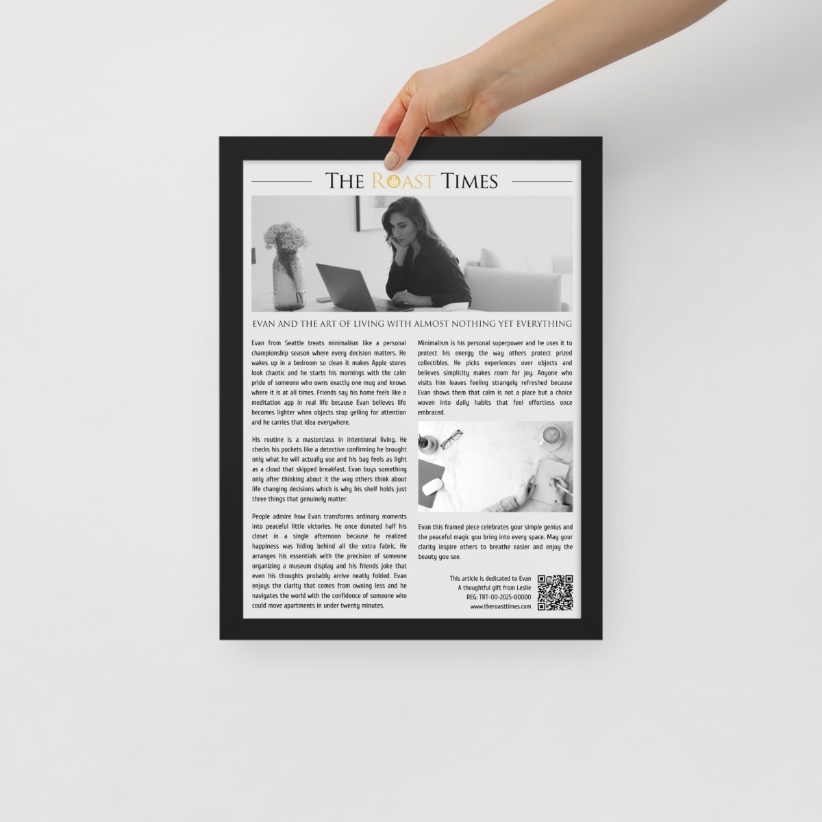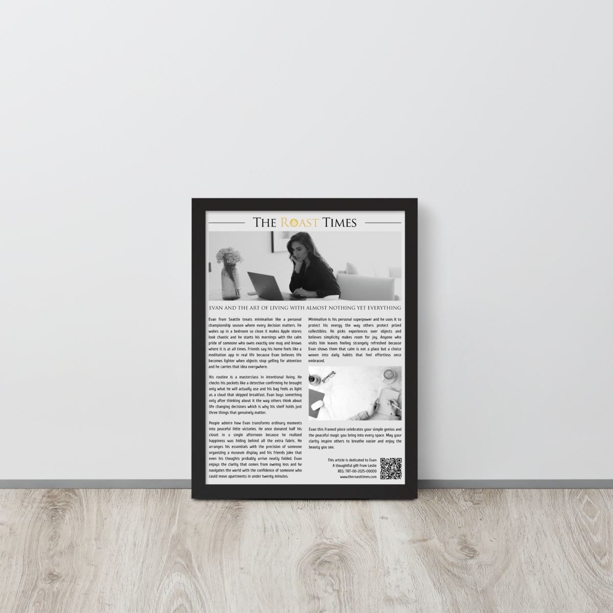 Finding a meaningful gift for a minimalist can feel almost impossible in a world where most presents end up forgotten in a drawer or quietly regifted during the next holiday season. This framed article solves that problem with elegance because it is not another object to store, it is a personalized piece of storytelling created specifically for someone who values intentional living. Instead of adding clutter, it adds meaning and recognition. It is the kind of gift that fits perfectly into a lifestyle built on clarity and presence.