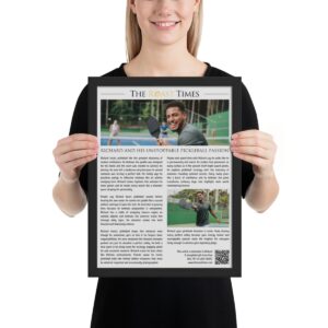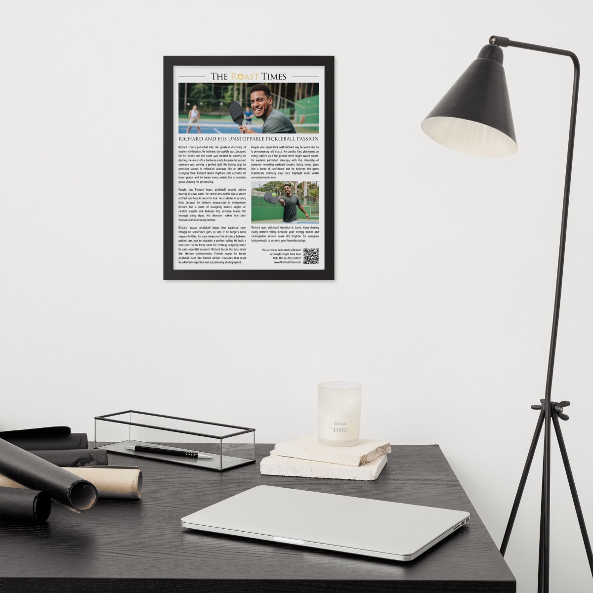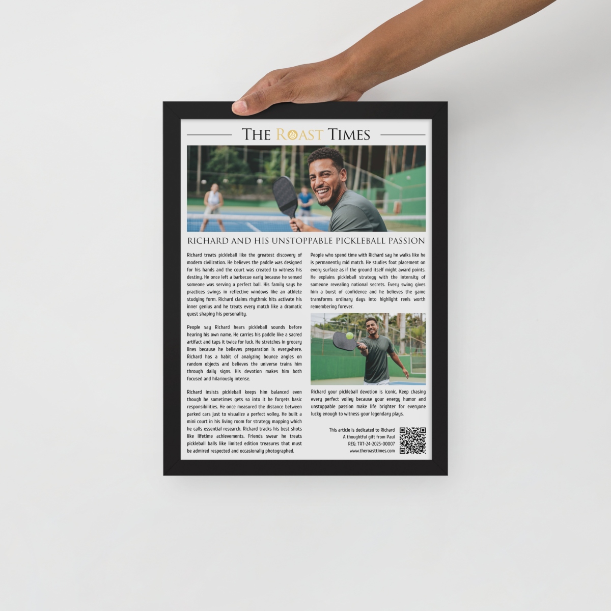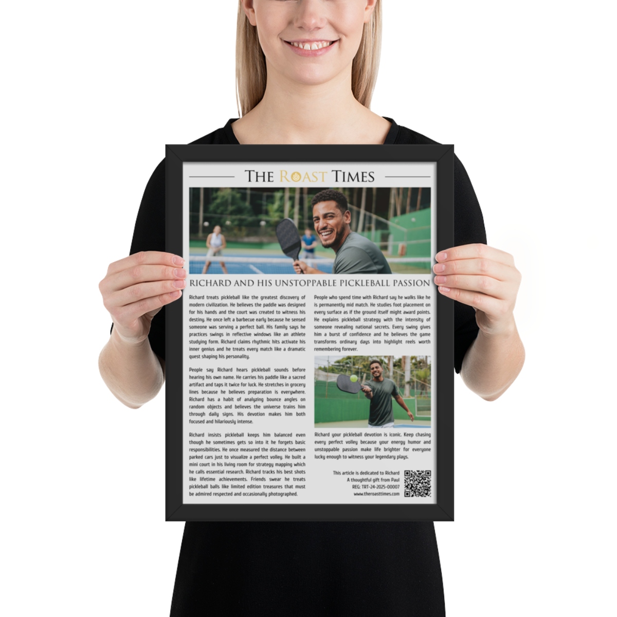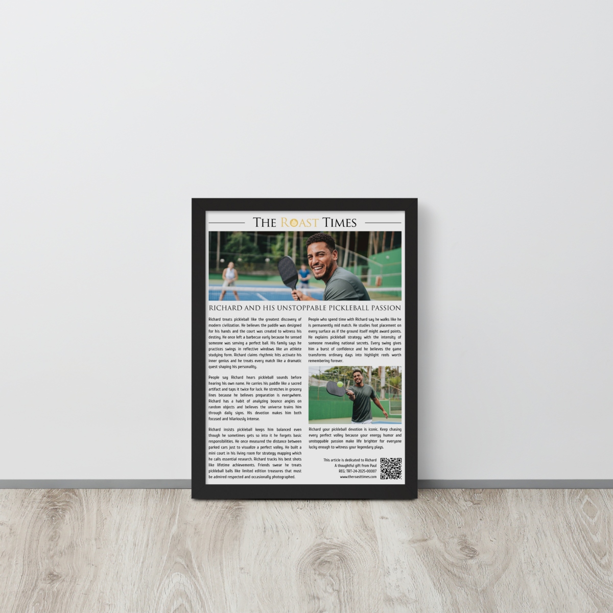This framed editorial piece is the perfect gift for anyone who treats pickleball as their favorite source of energy joy and competitive spirit. Written in the signature The Roast Times style, it highlights the humor personality and everyday devotion that define true pickleball lovers. Each article is printed and framed with careful detail, and it includes a QR code placed at the bottom of the framed piece. That same footer features a subtle mention of the person giving the gift, allowing the buyer to become part of the emotional meaning behind the article.