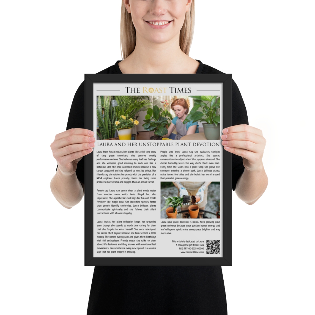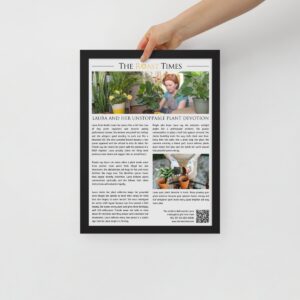 This framed editorial piece is the perfect gift for anyone who treats their plants as living companions filled with personality color and soothing energy. Written in the signature The Roast Times style, it highlights the humor passion and peaceful devotion that define plant lovers everywhere. Each article is printed and framed with careful detail, and it includes a QR code placed at the bottom of the framed piece. That same footer features a subtle mention of the person giving the gift, allowing the buyer to become part of the emotional meaning behind the tribute.