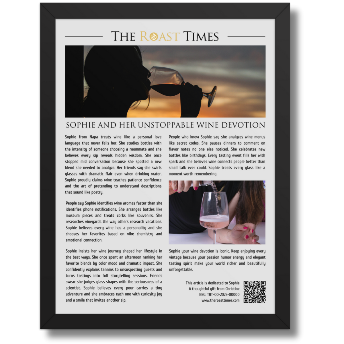 This framed editorial piece is the perfect gift for anyone who treats wine as an experience filled with flavor stories and elegance. Written in the signature The Roast Times style, it highlights the humor passion and refined devotion that define true wine lovers. Each article is printed and framed with careful detail, and it includes a QR code placed at the bottom of the framed piece. That footer also includes a subtle mention of the person giving the gift so the buyer becomes part of the emotional meaning behind the tribute.