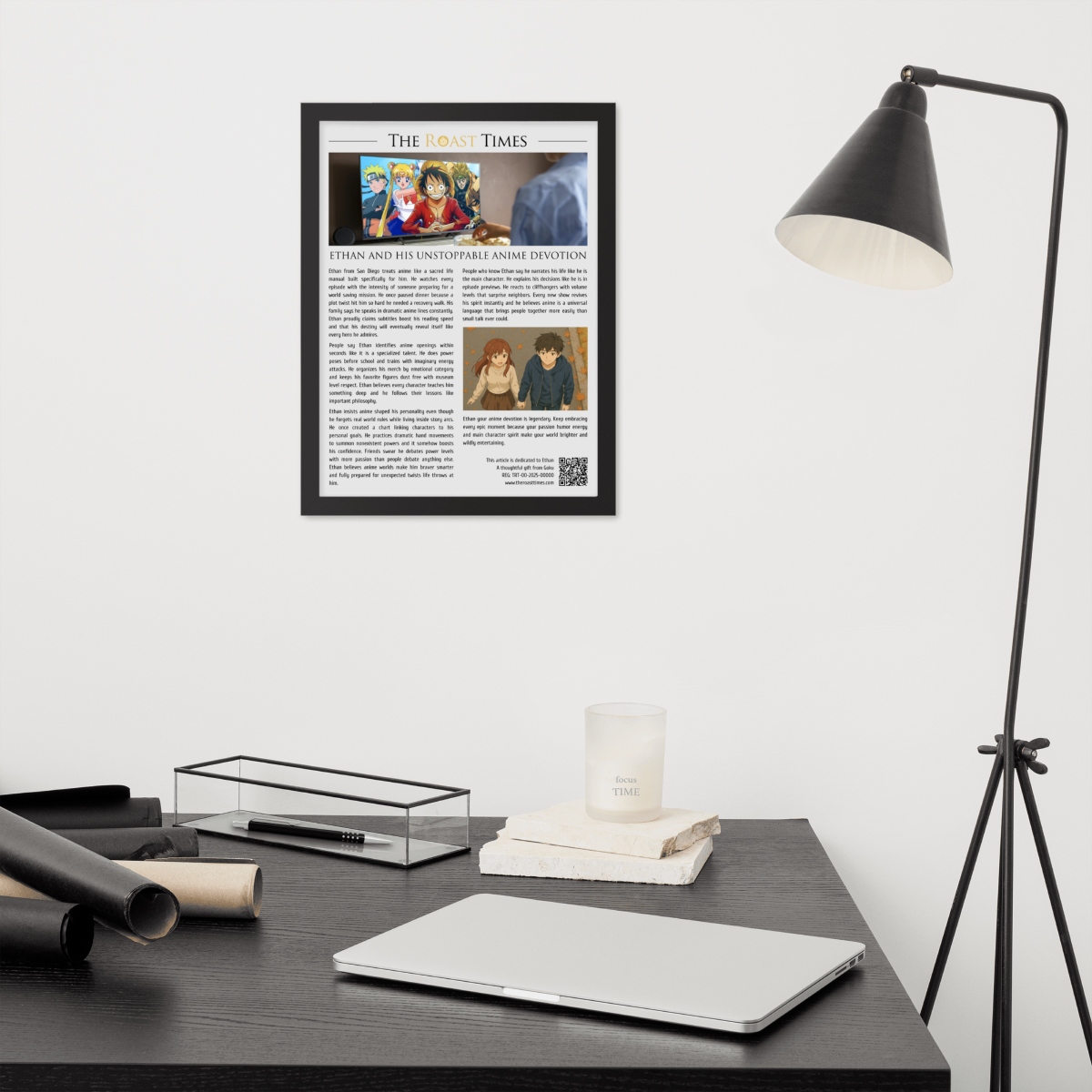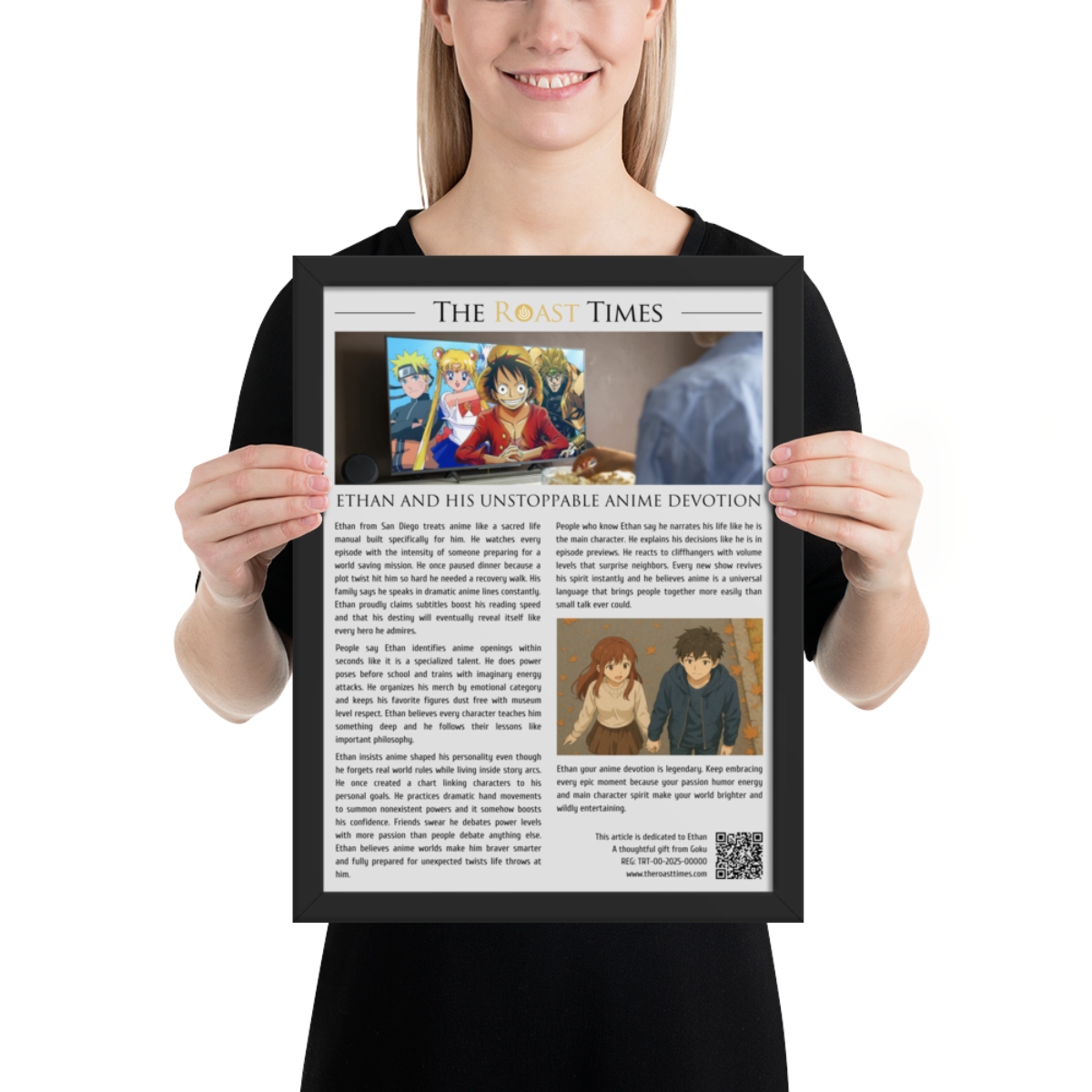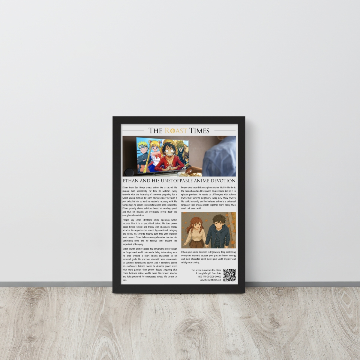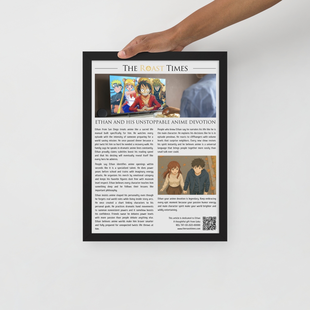 This framed editorial piece is the perfect gift for anyone who treats anime as more than entertainment. Written in the signature The Roast Times style, it highlights the humor passion and creative devotion that define true anime lovers. Each article is printed and framed with careful detail, and it includes a QR code placed at the bottom of the framed piece. That same footer features a subtle mention of the person giving the gift, allowing the buyer to become part of the emotional meaning behind the tribute.