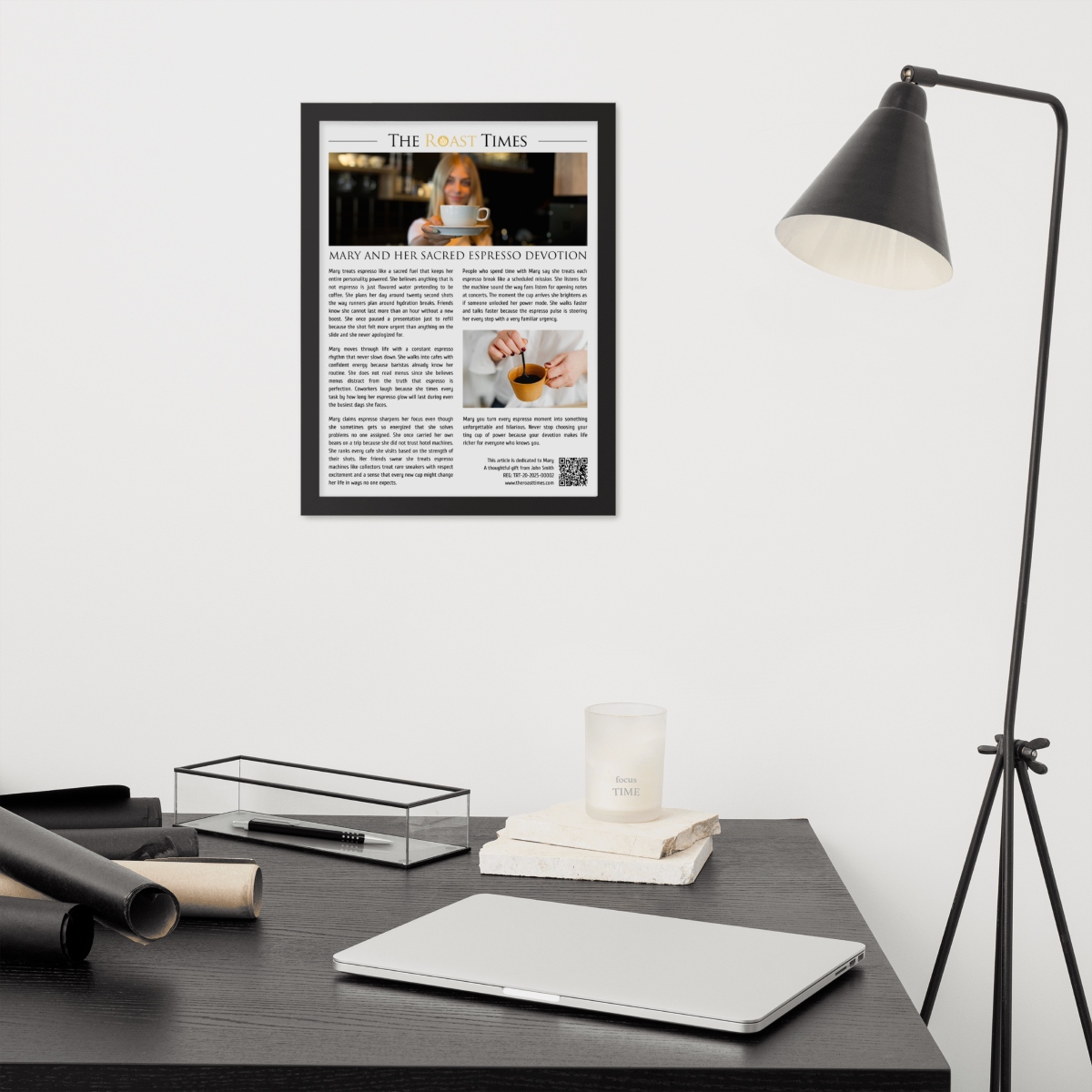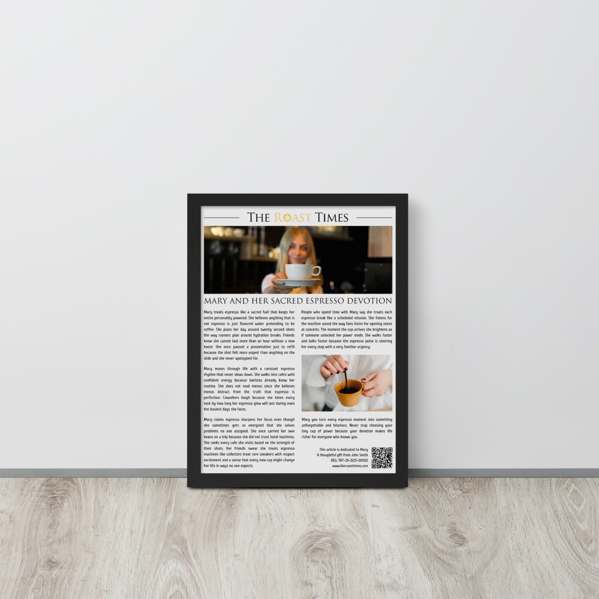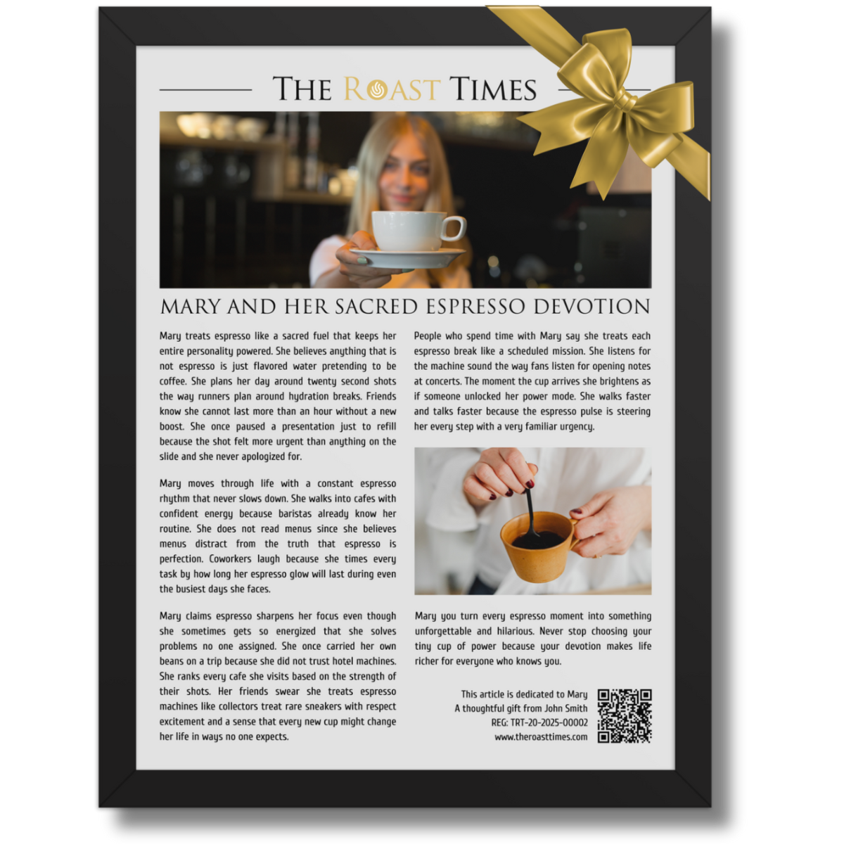 This framed editorial piece is the perfect gift for anyone who treats espresso as the only honest form of coffee. Written in the signature The Roast Times style, it highlights the humor, passion and daily devotion that define every true espresso lover. Each article is printed and framed with careful detail, and it includes a QR code placed at the bottom of the framed piece. That same footer features a subtle mention of the person giving the gift, allowing the buyer to become part of the story in a personal way.