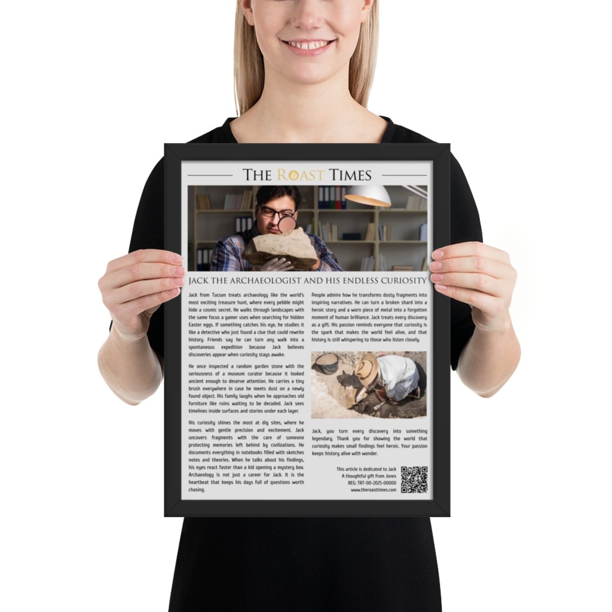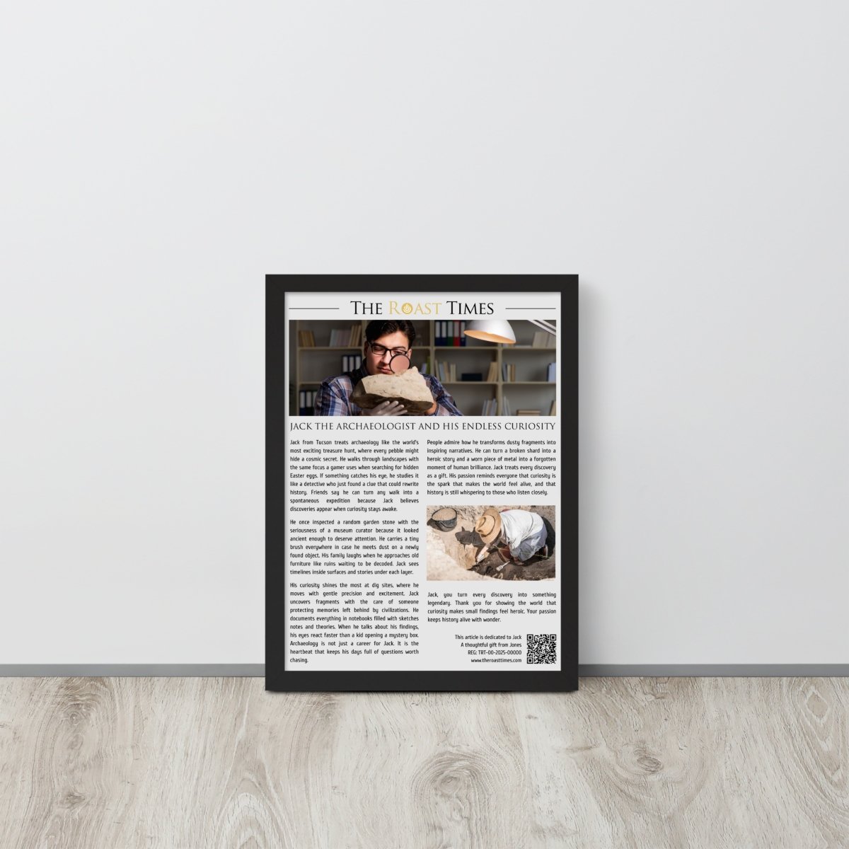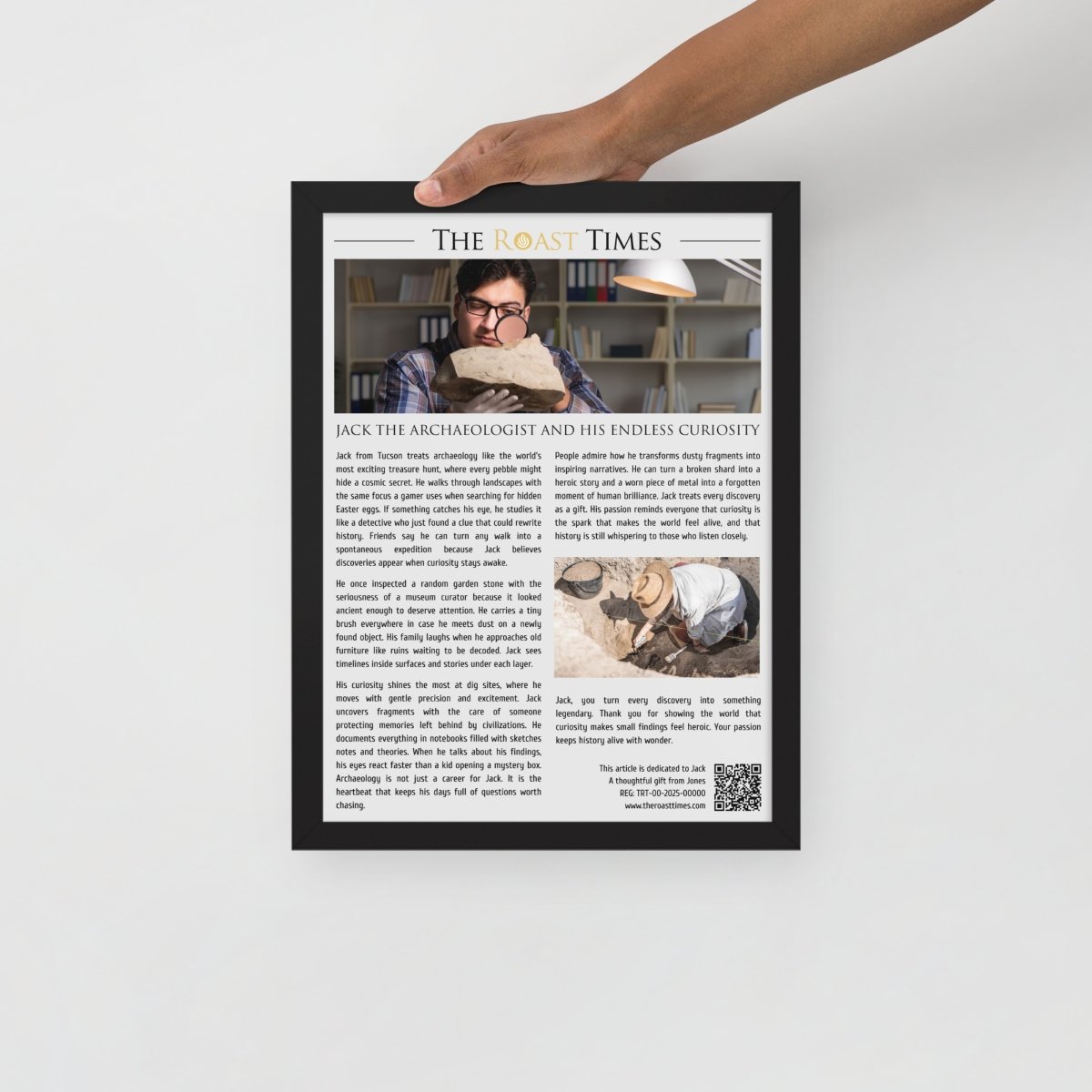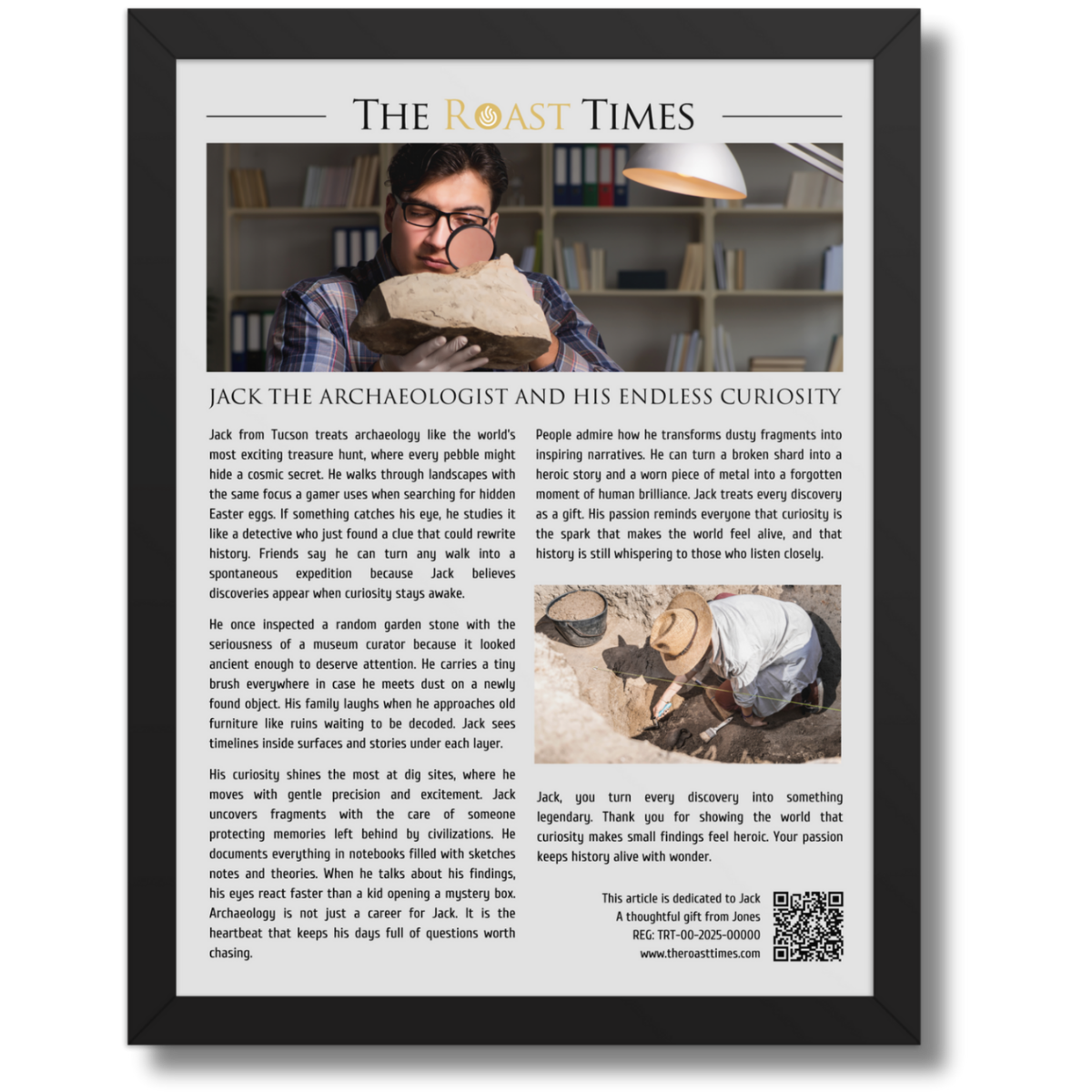 This framed article is the perfect gift for someone like Jack, whose heart belongs to archaeology and the thrill of uncovering stories hidden beneath time. It celebrates the humor passion and curiosity of a person who treats every object as a potential doorway into human history.