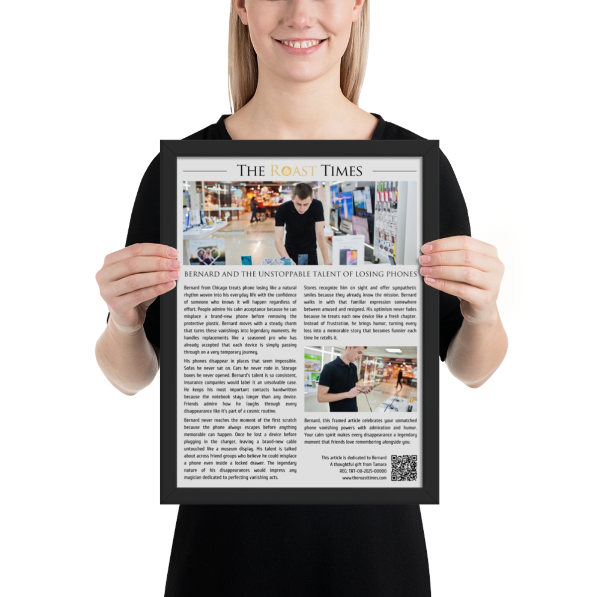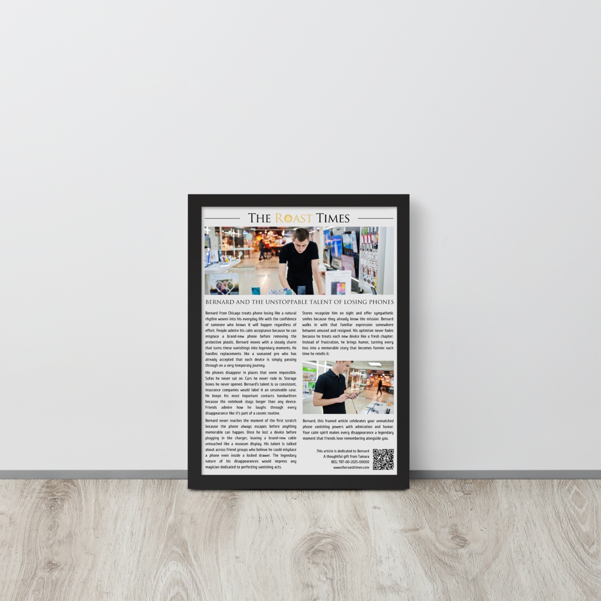 Bernard, this framed article celebrates your unmatched phone vanishing powers with admiration and humor. Your calm spirit makes every disappearance a legendary moment that friends love remembering alongside you.
