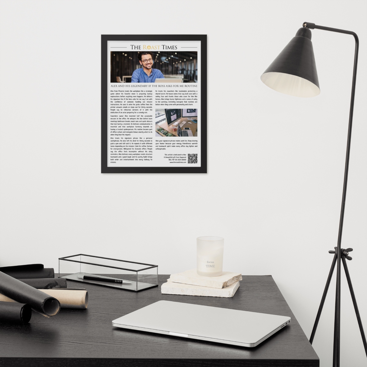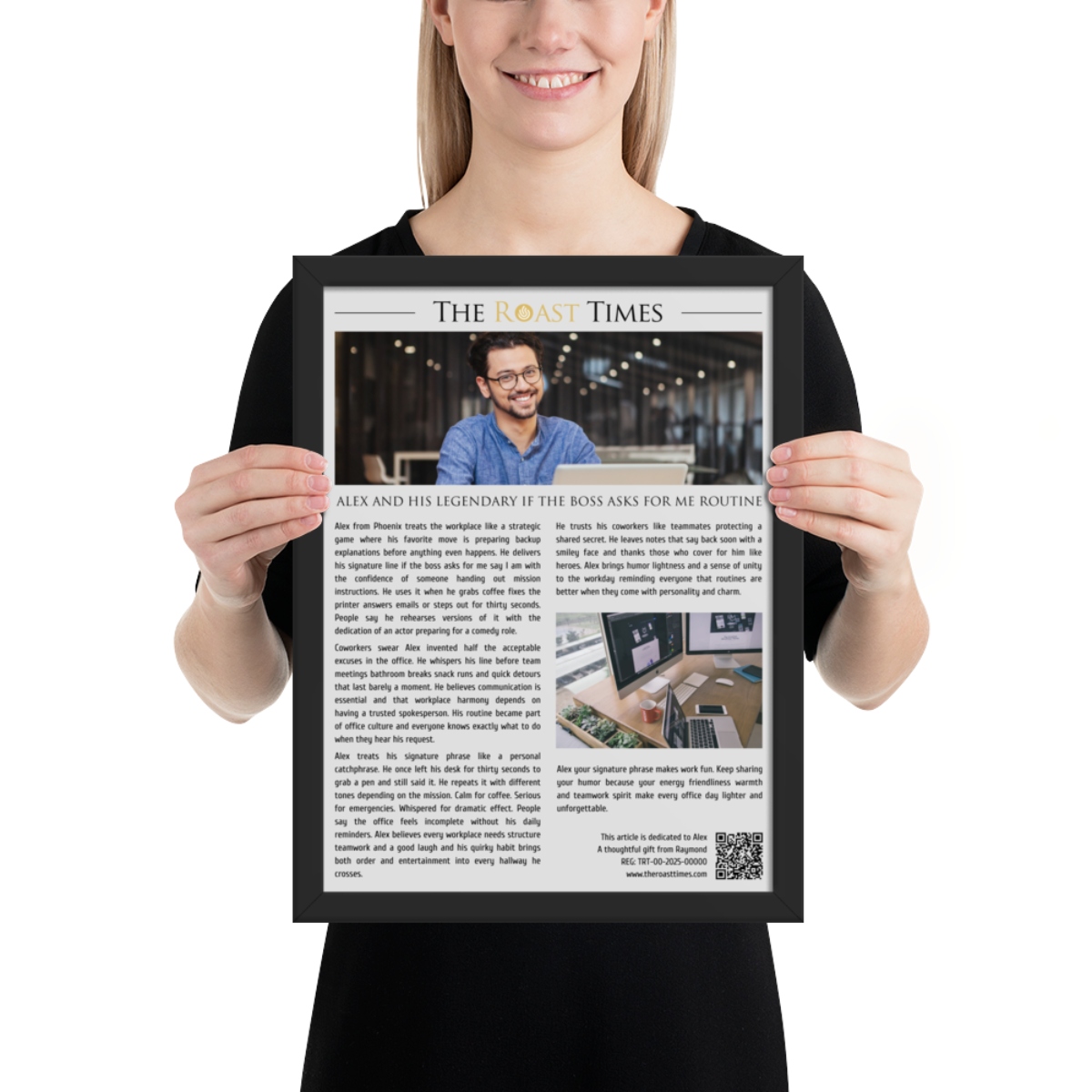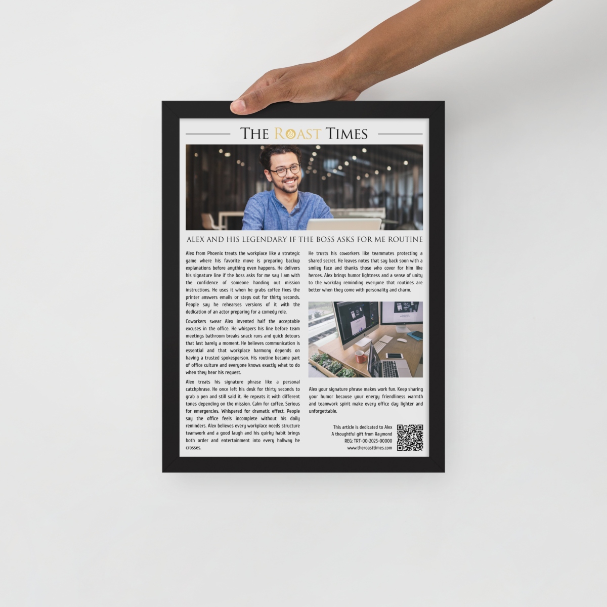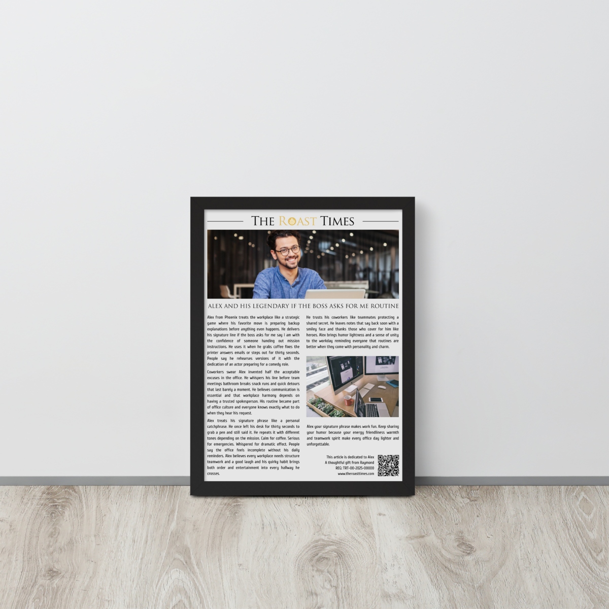 This framed editorial piece is created to honor coworkers with unforgettable habits personalities and office rituals. Written in the signature The Roast Times style it captures the charm humor and everyday moments that make a colleague truly memorable. Whether the obsession is a signature catchphrase a daily routine or a unique workplace quirk the article transforms it into a tribute filled with personality. Each framed piece includes a QR code printed at the bottom along with a subtle mention of the person giving the gift so the buyer becomes part of the emotional meaning behind the story.
